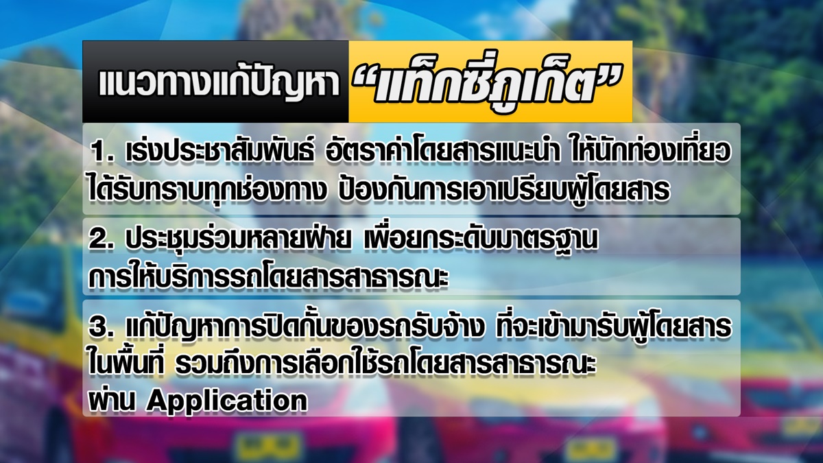 นายจตุรงค์ แก้วกสิ ขนส่งจังหวัดภูเก็ต กล่าวว่า ผลการประชุมในวันนี้ มีมติเร่งประชาสัมพันธ์อัตราค่าโดยสารแนะนำที่กำหนดโดย จ.ภูเก็ต ให้นักท่องเที่ยวได้รับทราบทุกช่องทาง ทั้งที่สนามบินภูเก็ต ด่านท่าฉัตรไชย และพื้นที่โรงแรมต่างๆ โดยจะจัดทำเป็นสติกเกอร์ และแผ่นพับประชาสัมพันธ์ เพื่อให้นักท่องเที่ยวสามารถดาวน์โหลดราคาแนะนำต่างๆ ได้ด้วยตนเอง พร้อมทั้งจะให้ผู้ให้บริการรถแท็กซี่ ใช้ราคาดังกล่าวเป็นราคากลางในการให้บริการแก่นักท่องเที่ยว เพื่อให้เกิดความเป็นธรรมในการเก็บค่าโดยสาร และป้องกันการเอาเปรียบผู้โดยสารต่อไป