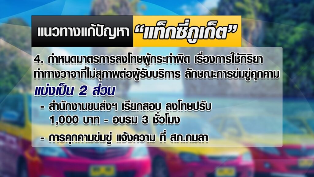 ภูเก็ต 31 ม.ค. – บอร์ดควบคุมการขนส่งทางบกภูเก็ต เรียกตัวแท็กซี่พูดจาข่มขู่นักท่องเที่ยวและเรียกเก็บค่าแท็กซี่สูงเกินจริง เข้าชี้แจง เพื่อวางแนวทางแก้ปัญหาในภาพรวม ขณะที่ขนส่งฯ เตรียมเรียกเสียค่าปรับ 1,000 บาท พร้อมอบรม 3 ชม. เหตุมีพฤติกรรมไม่เหมาะสม