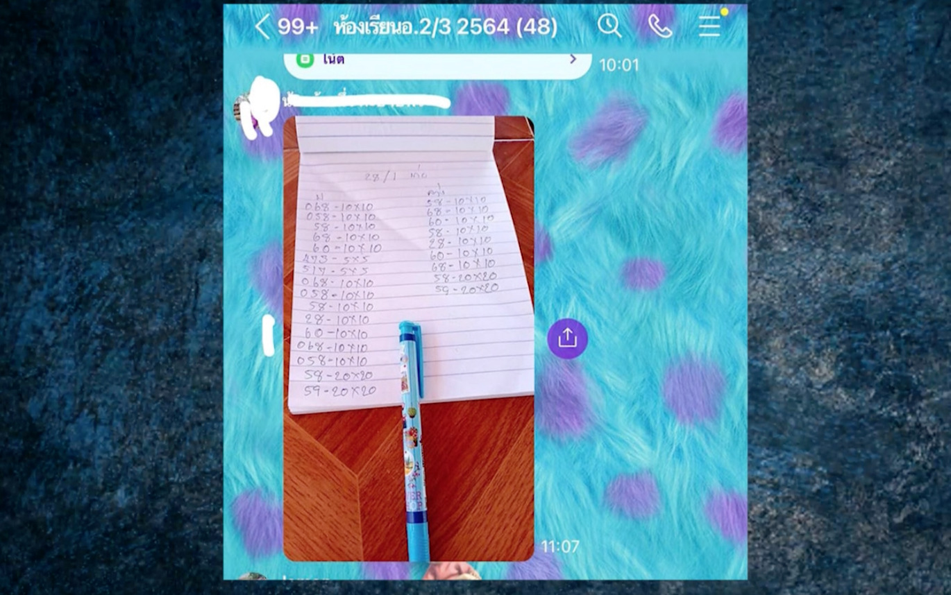 แม่ค้าลอตเตอรี่รายหนึ่งโพสต์ภาพแคปหน้าจอจากไลน์กลุ่มโรงเรียนแห่งหนึ่งไม่ระบุชื่อ ระบุว่าเป็น ป.2/2 ปีการศึกษา 2564 โดยมีคุณแม่รายหนึ่งส่งข้อความปริศนา เป็นตัวเลขแถวยาวเหยียด บน-ล่าง คูณๆ พร้อมกับตัวเลข 2 หลัก ต่อท้ายด้วย = 100 เป็นจำนวนมาก มองอย่างไรก็ไม่ใช่วิชาคณิตศาสตร์ หรือการบ้านลูกแน่ๆ คุณครูโรงเรียนรีบเข้ามาตอบแซวคุณแม่ทันทีว่า “คุณแม่น่าจะผิดกลุ่มนะคะ” ทั้งมีผู้หวังดีท้วงไปว่า คุณแม่น่าจะส่งผิดกลุ่มนะคะ แต่หลังจากทักไป แต่คุณแม่ก็ไม่ได้ตอบอะไร เจ้าของโพสต์ยังระบุว่า “ตอนนี้คุณแม่ยังไม่รู้ตัวเลย เป็นห่วงจัง กลัวจะส่งเจ้ามือไม่ทัน ทั้งระบุว่า คุณแม่ต้องใจเย็นๆ นะคะ ยังพอมีเวลาซื้อ”