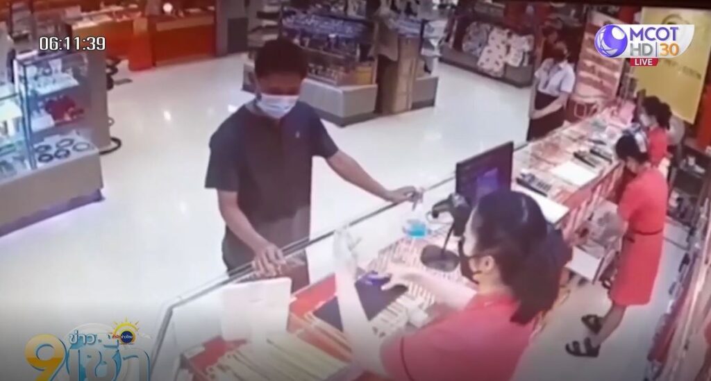 กล้องวงจรปิดจับภาพคนร้ายอายุประมาณ 30-40 ปี ทำทีเข้ามาซื้อทองในร้านทองเยาวราชกรุงเทพ ภายในเทสโก้ โลตัส อ.พนัสนิคม จ.ชลบุรี พนักงานก็นำทองมาให้เลือก คนร้ายยืนเลือกสักพักก็หยิบสร้อยคอทองคำรวม 7 บาท มูลค่า 206,000 บาท วิ่งออกไปจาก