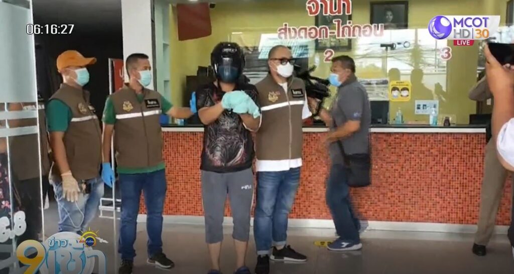 ตำรวจภูธรศรีราชา จ.ชลบุรี คุมตัวนายพงษ์พันธ์ อายุ 42 ปี บุกเดี่ยวชิงทองในโรงรับจำนำแม่วรรณี อ.ศรีราชา โดยการใช้ค้อนทุบตู้กระจกแตก กวาดทองรูปพรรณหนัก 13 บาท วิ่งไปขึ้นรถจักรยานยนต์หลบหนี ไปทำแผนประกอบคำรับสารภาพ.-สำนักข่าวไทย