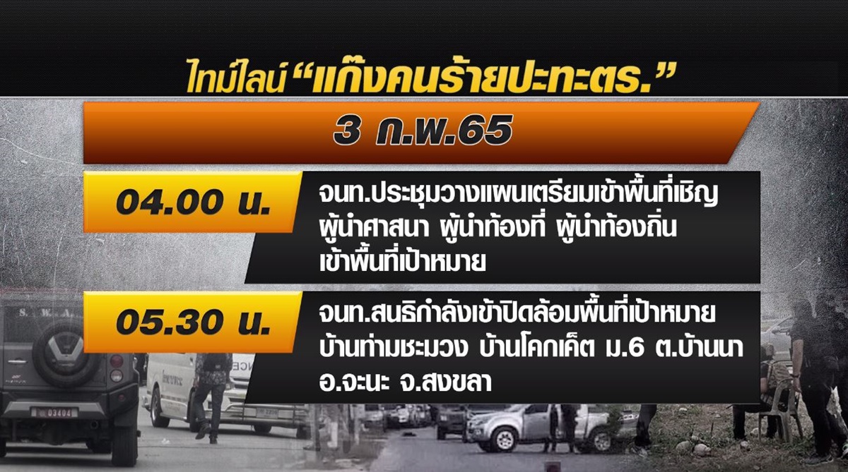 สำหรับไทม์ไลน์ปฏิบัติการครั้งนี้ เริ่มเมื่อเวลา 04.00 น. เจ้าหน้าที่ประชุมวางแผนเตรียมเข้าพื้นที่ เชิญผู้นำศาสนา ผู้นำท้องที่ ผู้นำท้องถิ่น เข้าพื้นที่เป้าหมาย