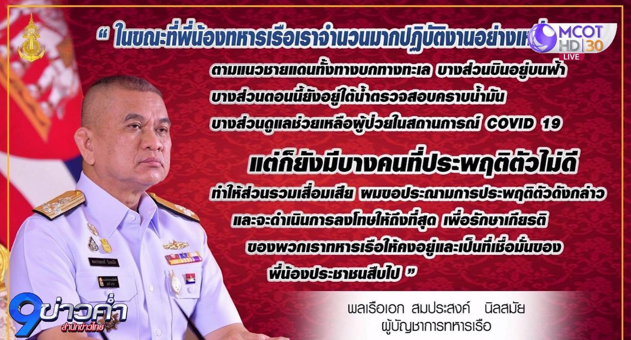 ขณะเดียวกัน พล.ร.อ.สมประสงค์ นิลสมัย ผู้บัญชาการทหารเรือ ได้ส่งข้อความไปยังกำลังพลทุกนาย ใจความสรุปว่า ในขณะที่พี่น้องทหารเรือปฏิบัติงานอย่างเหนื่อยยาก แต่ก็ยังมีบางคนที่ประพฤติตัวไม่ดี ทำให้ส่วนรวมเสื่อมเสีย ผมขอประณามการประพฤติตัวดังกล่าว และจะดำเนินการลงโทษให้ถึงที่สุด เพื่อรักษาเกียรติของพวกเราทหารเรือให้คงอยู่ และเป็นที่เชื่อมั่นของพี่น้องประชาชนสืบไป. – สำนักข่าวไทย