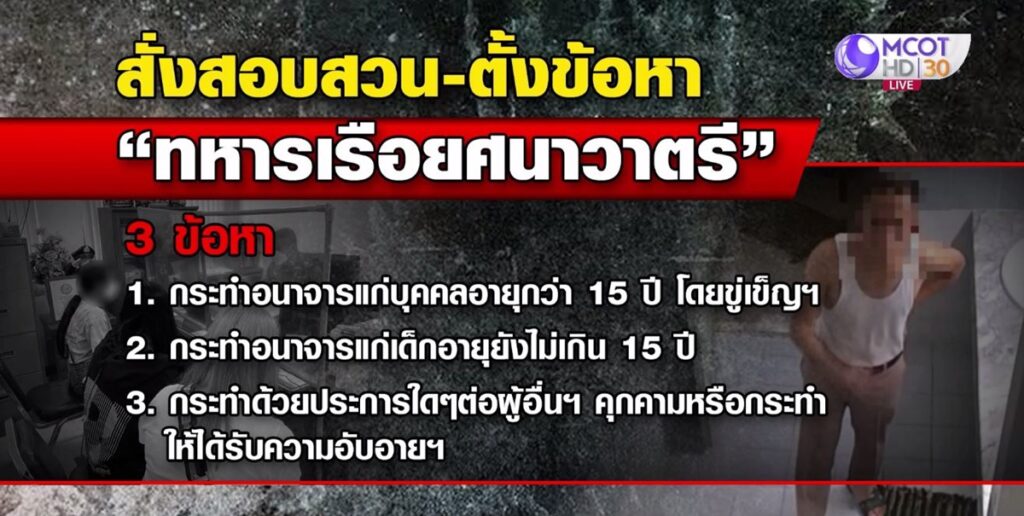 พ.ต.ท.เอกชัย มูลลี สารวัตรเวรสอบสวน สภ.พลูตาหลวง กล่าวว่า เบื้องต้นได้ประสานไปยังต้นสังกัดของนาวาตรีคนดังกล่าว ซึ่งถูกลงโทษทางวินัย เพื่อจะทำการสอบสวนและตั้งข้อหา เบื้องต้นตั้ง 3 ข้อหา คือ 1. กระทำอนาจารแก่บุคคลอายุกว่า 15 ปี โดยขู่เข็ญด้วยประการใดๆ โดยใช้กำลังประทุษร้าย โดยบุคคลนั้นอยู่ในภาวะที่ไม่สามารถขัดขืนได้ 2. กระทำอนาจารแก่เด็กอายุยังไม่เกิน 15 ปี โดยเด็กนั้นจะยินยอมหรือไม่ก็ตาม โดยขู่เข็ญด้วยประการใดๆ โดยใช้กำลังประทุษร้าย โดยเด็กนั้นอยู่ในภาวะที่ไม่สามารถขัดขืนได้ และ 3. กระทำด้วยประการใดๆ ต่อผู้อื่น อันเป็นการรังแก ข่มเหง คุกคาม หรือกระทำให้ได้รับความอับอาย หรือเดือดร้อนรำคาญ ซึ่งเป็นการกระทำในที่สาธารณสถาน หรือเป็นการกระทำอันมีลักษณะส่อไปในทางที่จะล่วงเกินทางเพศ ซึ่งทางต้นสังกัดได้แจ้งมายังตำรวจ จะนำตัวนาวาตรีคนดังกล่าวมาสอบสวนในวันที่ 10 กุมภาพันธ์นี้