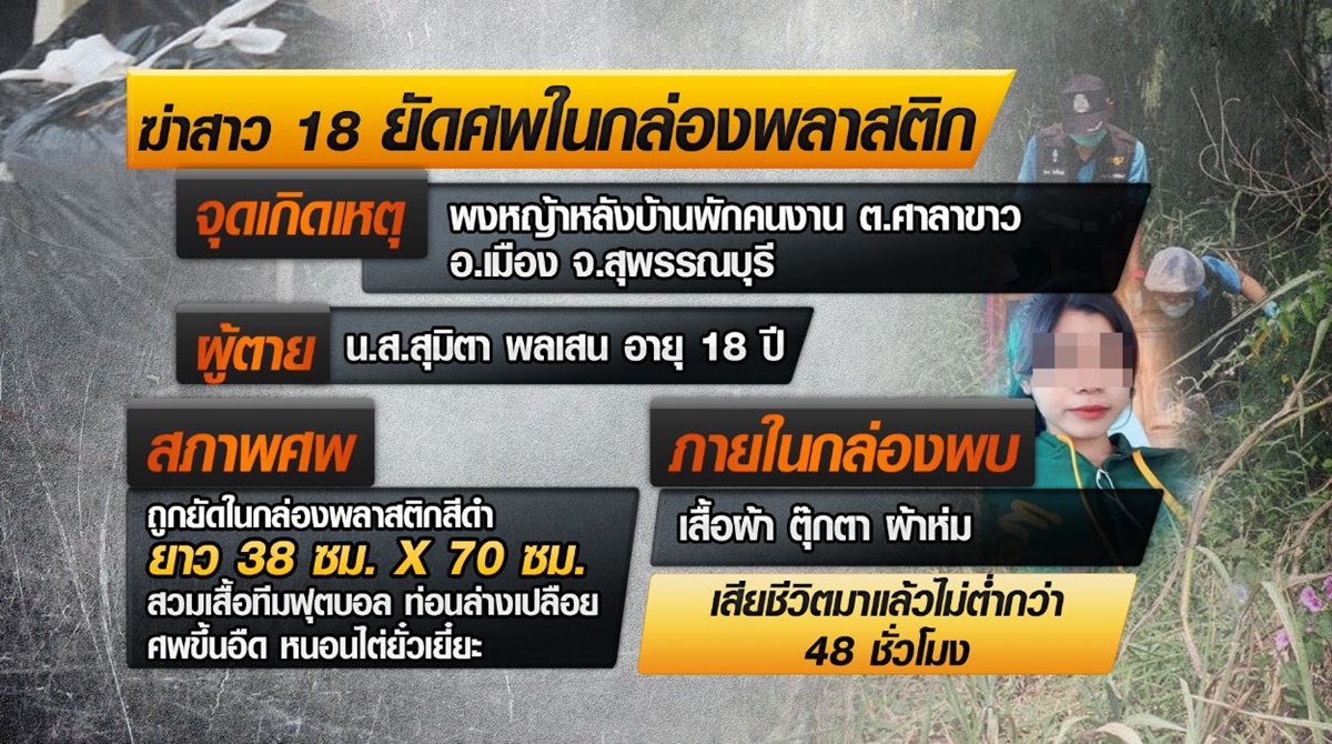 สุพรรณบุรี 4 ก.พ. – พบศพสาววัย 18 ปี ถูกฆ่ายัดกล่องดำ หมกพงหญ้าหลังบ้านพักคนงานที่ จ.สุพรรณบุรี ล่าสุดจับมือฆ่าได้แล้ว