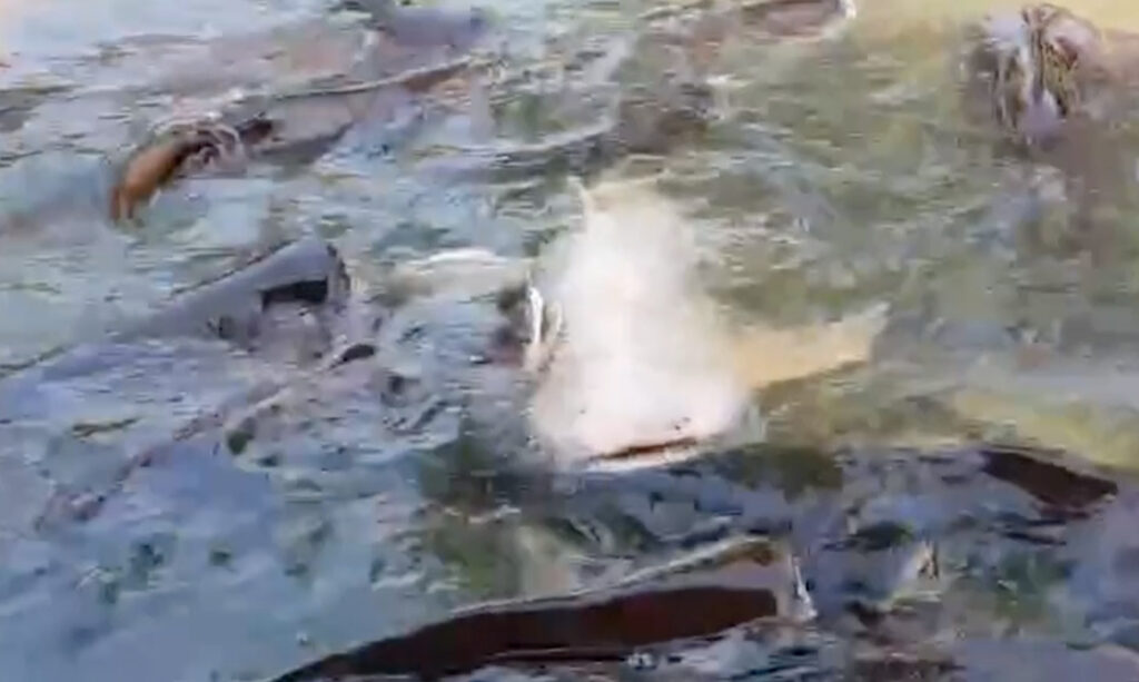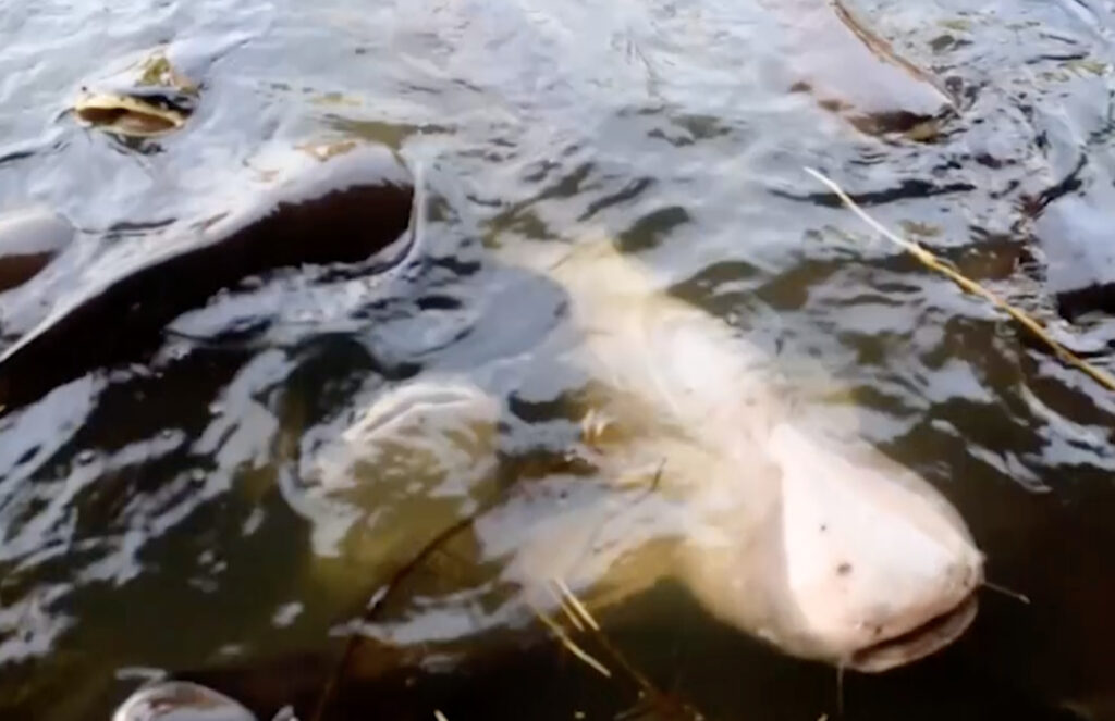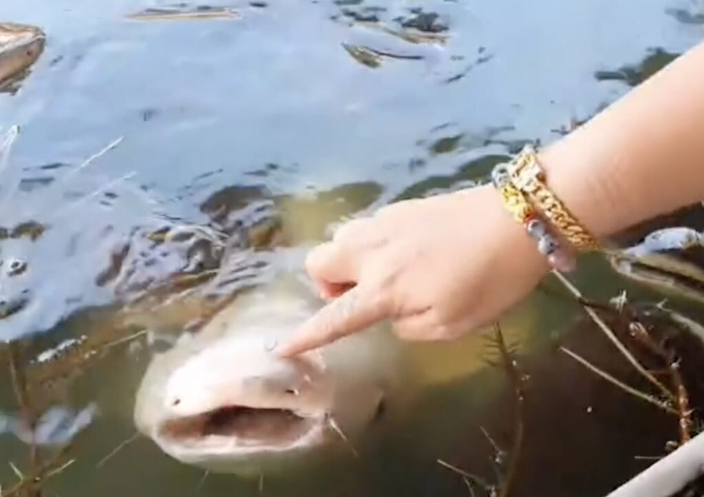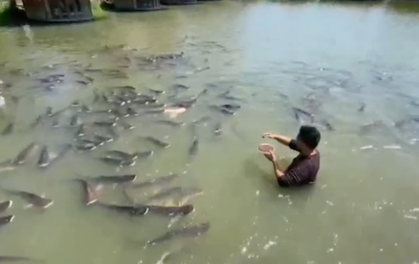 นายชายน้ำ อร่ามเรือง เจ้าของสวนอาหาร อายุ 33 ปี ลงไปในสระน้ำร้องเรียกชื่อ “เจ้าเผือก” เพื่อให้อาหาร ซึ่งปลาสวายฝูงนี้เชื่องมากจับและลูบคลำหัวได้ โดยเฉพาะปลาสวายเผือกที่มีอยู่ 1 ตัว ลูกค้าที่มาทานอาหารที่แพจะเข้ามาชมและลูบคลำที่หัวปลาสวายได้ ลูกค้าที่มาทานอาหารและนักท่องเที่ยวต่างตื่นเต้นกับความเชื่องของเจ้าสวายเผือกมาก พากันมาให้อาหารเจ้าเผือก ที่โผล่ขึ้นมาเหนือน้ำไล่กินอาหาร สร้างความตื่นเต้นและประทับใจเพราะเจ้าเผือกสวยงามและหาดูได้ยากในแม่น้ำธรรมชาติ