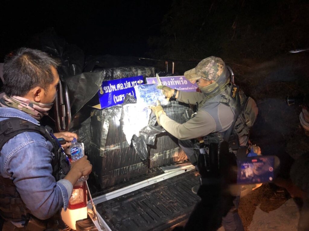 จากนั้นในช่วงเย็น เวลา 19.30 น. หน่วยเรือรักษาความสงบเรียบร้อยตามลำแม่น้ำโขงได้รับการประสานงานข่าวว่าจะมีกลุ่มขบวนการเคลื่อนไหว โดยให้เน้นตรวจสอบรถกระบะสีขาวติดลูกกรงและมีผ้าใบสีดำคลุมอยู่ด้านหลัง เจ้าหน้าที่จึงบูรณาการวางจุดสกัดและเฝ้าระวัง กระทั่งเวลา 21.00 น. ตรวจพบรถยนต์ต้องสงสัย เป็นรถกระบะยี่ห้ออีซูซุ สีขาว บริเวณสามแยกบ้านต้อง จึงแสดงตัวเข้าตรวจค้น แต่บุคคลที่อยู่ในรถพยายามขับรถหลบหนี เจ้าหน้าที่จึงเร่งเครื่องติดตาม เมื่อเห็นว่าจวนตัว บุคคลต้องสงสัยได้จอดรถทิ้งไว้ริมทางแล้ววิ่งหลบหนีหายไปในความมืด บริเวณทางหลวงแผ่นดินหมายเลข 2104 บ้านดอนพัฒนา ตำบลพิมาน อำเภอนาแก เจ้าหน้าที่พยายามค้นหาแต่ไม่พบบุคคลต้องสงสัย จึงย้อนกลับมาตรวจสอบรถคันดังกล่าว ปรากฏว่าบนรถมีกัญชา 25 กระสอบ รวมน้ำหนัก 1,056 กิโลกรัม