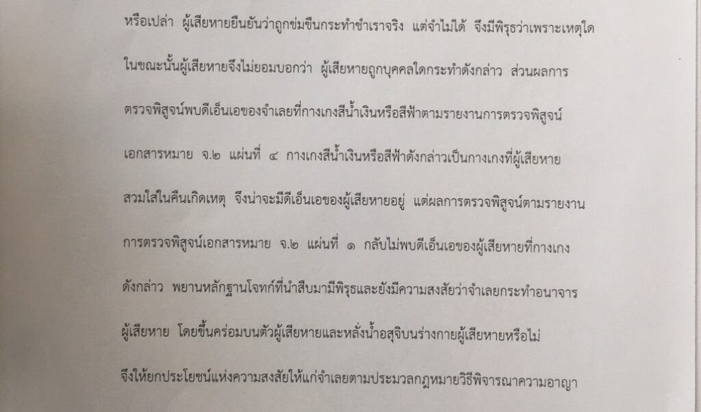 ศาลชั้นต้นพิพากษาว่า จำเลยกระทำความผิดฐานกระทำอนาจารผู้อื่น และให้ยกประโยชน์แห่งความสงสัยในข้อหาข่มขืนกระทำชำเรา เนื่องจากผลการตรวจพิสูจน์ทางนิติวิทยาศาสตร์ไม่พบเชื้ออสุจิในช่องคลอดของผู้เสียหาย แต่พบหลักฐานว่ากางเกงของผู้เสียหายที่ใส่ในคืนเกิดเหตุ เมื่อนำไปตรวจพิสูจน์แล้วพบ DNA ของจำเลยอยู่ที่กางเกงตัวดังกล่าวโดยไม่พบอสุจิ จึงพิพากษาว่าจำเลยมีความผิดตามประมวลกฎหมายอาญา มาตรา 278(เดิม) ลงโทษจำคุก 3 ปี และให้จำเลยชำระเงินแก่ผู้เสียหาย 200,000 บาท พร้อมดอกเบี้ยอัตราร้อยละ 7.5 ต่อปี นับแต่วันที่เกิดเหตุจนกว่าจะชำระเสร็จ จำเลยอุทธรณ์ ศาลอุทธรณ์ภาค 7 พิพากษายืนตามศาลชั้นต้น ต่อมาจำเลยฎีกา โดยผู้พิพากษาซึ่งพิจารณาและลงชื่อในคำพิพากษาศาลชั้นต้นอนุญาตให้ฎีกาในปัญหาข้อเท็จจริง