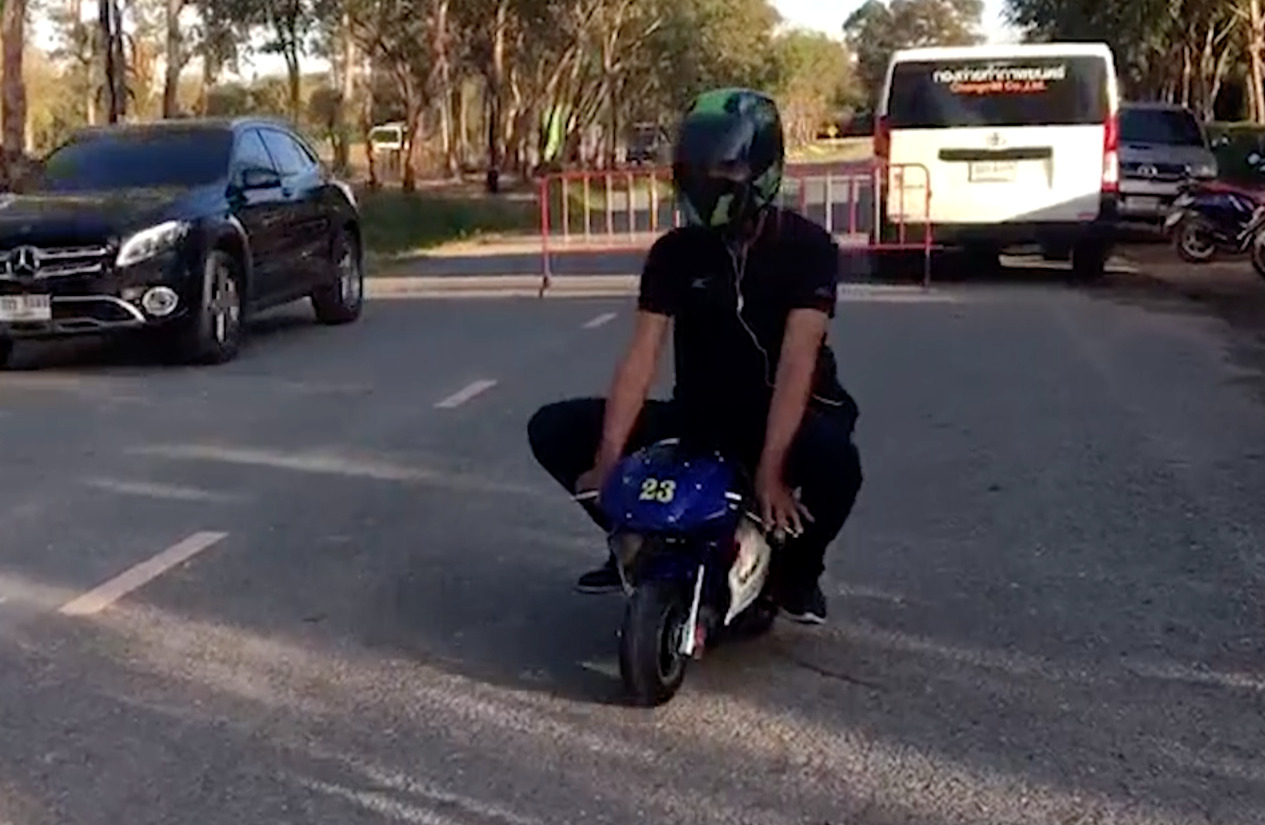 รถจักรยานยนต์ขนาดจิ๋วแต่แจ๋วของ สิบโทภัคพล มาว่อง อายุ 27 ปี ตำแหน่งพลขับ และช่างซ่อมยานยนต์ หน่วยงานทหารแห่งหนึ่งในจังหวัดเชียงใหม่ รถคันนี้ขนาดเครื่องยนต์ 50 ซีซี ความสูงตัวรถจากพื้นประมาณ 30 เซนติเมตร ใช้มือดึงเชือกสตาร์ทเหมือนเครื่องตัดหญ้า สามารถขับขี่และใช้ในการเดินทางในชุมชน หรือในหน่วยงานได้ ประหยัดน้ำมัน และใช้ความเร็วไม่มาก น้ำหนักเบา
