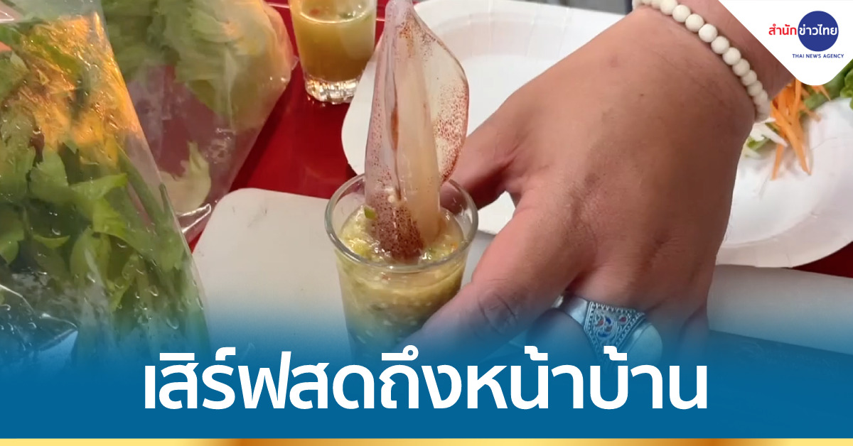 สมุทรปราการ 9 ก.พ.- พ่อค้าซาซิมิปรับตัวให้เข้ากับเศรษฐกิจ นำหมึกสด กุ้งสด ส่งตรงถึงหน้าบ้าน หั่นกันสดๆ เสิร์ฟถึงหน้าบ้านลูกค้า