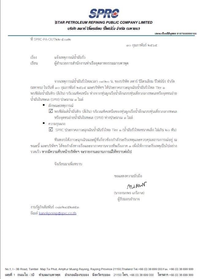 ทั้งนี้ SPRC ได้ทำหนังสือถึงผู้ว่าฯ ระยอง เรื่องแจ้งเหตุการณ์น้ำมันรั่วในวันที่ 10 ก.พ. ระบุว่า เกิดเหตุมันรั่วไหลเวลา 09.20 น. และบริษัทได้ประกาศภาวะฉุกฉินน้ำมันรั่วไหล Tler 1 พบฟิล์มน้ำมันดิบ (สีเงิน) บริเวณทิศเหนือ ห่างจากทุ่นผูกเรือน้ำลึกแบบทุ่นเดี่ยวกลางทะเล หรือจุดชนถ่ายน้ำมันในทะเล (5PM) ประมาณ 3 ไมล์ ลักษณะเหตุการณ์พบฟิล์มส์น้ำมันดิบ (สีเงิน) บริเวณทิศเหนือของหุ่นผูกเรือน้ำลึกแบบทุ่นเดี่ยวกลางทะเล หรือจุดขนถ่ายน้ำมันในทะเล (SPM) ห่างประมาณ 3 ไมล์ , ความรุนแรง SPRC ประกาศภาวะฉุกเฉินน้ำมันรั่วไหล Tier 1 (น้ำมันรั่วไหลขนาดเล็ก ไม่เกิน 20 ตัน)