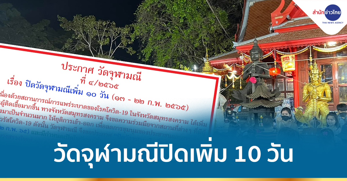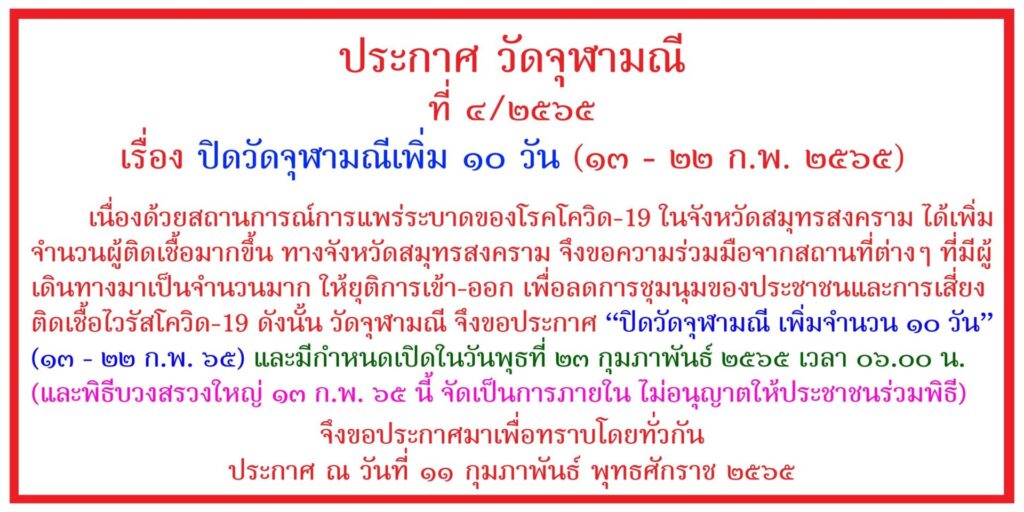 สมุทรสงคราม 12 ก.พ.- วัดจุฬามณี ประกาศปิดเพิ่ม 10 วัน ตั้งแต่ 13 – 22 ก.พ. 2565 หลังสถานการณ์โควิดในพื้นที่มียอดผู้ติดเชื้อมากขึ้น ส่วนพิธีบวงสรวงใหญ่ 13 ก.พ. จัดเป็นการภายใน