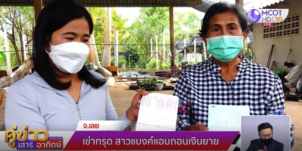 นางสมจิตร สุธงษา และนางมยุรี สุธงษา บุตรสาว ชาว ต.หนองบัว อ.ภูเรือ จ.เลย เปิดเผยกับผู้สื่อข่าวว่า เมื่อวันที่ 7 มกราคม 2565 นำเงินไปฝากธนาคาร สาขาภูเรือ ต่อมาพบว่าเงินฝากหายไปจากบัญชี จึงได้ตรวจสอบการเคลื่อนไหวของบัญชี พบว่ามีการถอนเงินออกไปทั้งหมด 9 ครั้ง รวมจำนวน 2,601,000 บาท โดยผู้ถอนไม่ใช่เจ้าของบัญชี