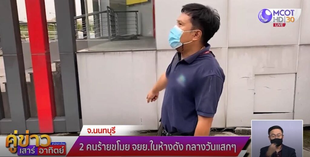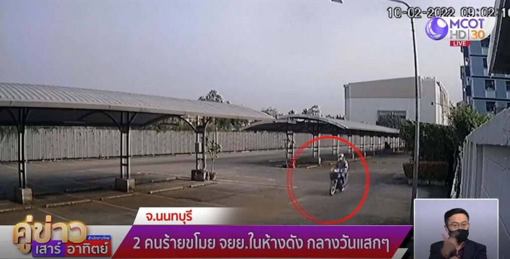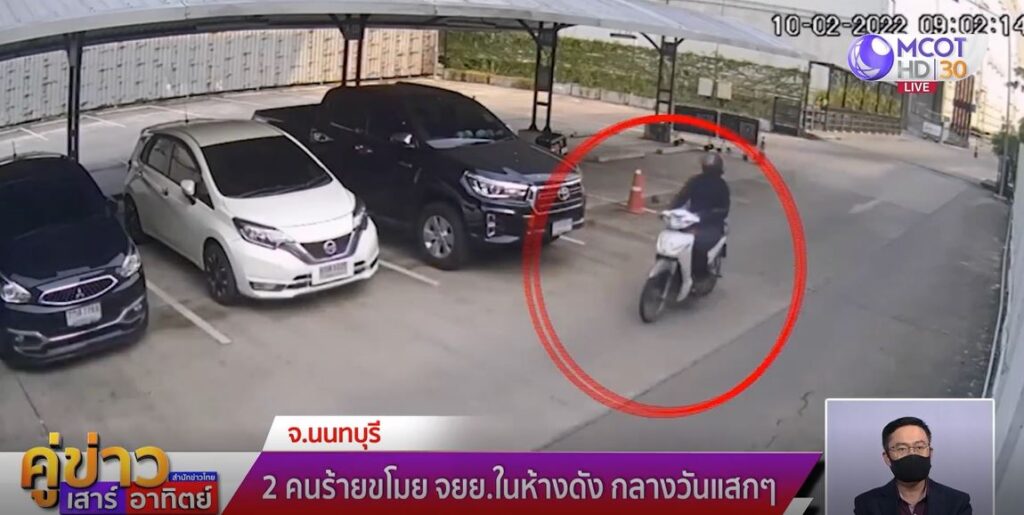 ต่อมาผู้สื่อข่าวลงพื้นที่เกิดเหตุในห้างฯ แห่งหนึ่งย่านบางกรวย จ.นนทบุรี พบนายประชาชาติ อาชีพพนักงานบริษัท ผู้เสียหายที่ถูก 2 คนร้ายเข้ามาขโมยจักรยานยนต์ยี่ห้อฮอนด้าเวฟ 110 สีน้ำเงิน ทะเบียน บขท 450 กรุงเทพฯ ราคา 20,000 บาท จากนั้นได้ขี่จักรยานยนต์หลบหนีมุ่งหน้าไปทางลัดมหาสวัสดิ์