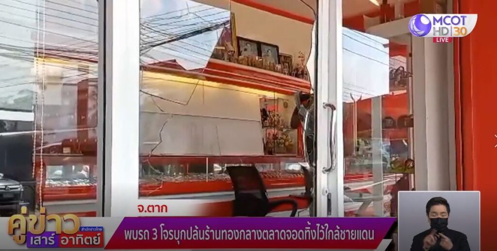 ส่วนที่เคาน์เตอร์ที่แขวนทองคำรูปพรรณ ถูกคนร้ายกวาดทองไปจนเกือบหมดตู้โชว์ เจ้าหน้าที่จึงปิดกั้นพื้นที่เกิดเหตุ พร้อมเร่งเปิดกล้องวงจรปิดเพื่อติดตามคนร้ายอย่างเร่งด่วน