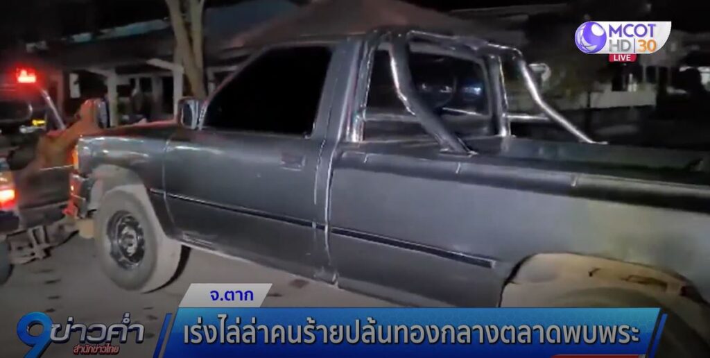 ต่อมาเจ้าหน้าที่ชุดไล่ล่าคนร้ายออกติดตามจนพบรถยนต์กระบะ หมายเลขทะเบียน บง-1910 คันที่คนร้ายใช้ก่อเหตุ แต่ไม่พบคนร้ายทั้งสามและทอง โดยคนร้ายจอดรถยนต์คันก่อเหตุไว้บนเส้นทางบ้านผากะเจ้อ หมู่ 9 ตำบลพบพระ อำเภอพบพระ ห่างจุดเกิดเหตุประมาณ 6 กิโลเมตร และห่างจากแนวชายแดนไทย-เมียนมา กว่า 8 กิโลเมตร ซึ่งเจ้าหน้าที่ได้ยกรถของคนร้ายไปเก็บไว้ที่ สภ.พบพระ ก่อนที่ตำรวจกองพิสูจน์หลักฐานจังหวัดตากเข้าเก็บวัตถุพยานหลักฐานภายในรถของกลางคันดังกล่าว พบวัตถุพยานหลักฐานสำคัญที่คนร้ายทิ้งไว้ในรถหลายรายการ