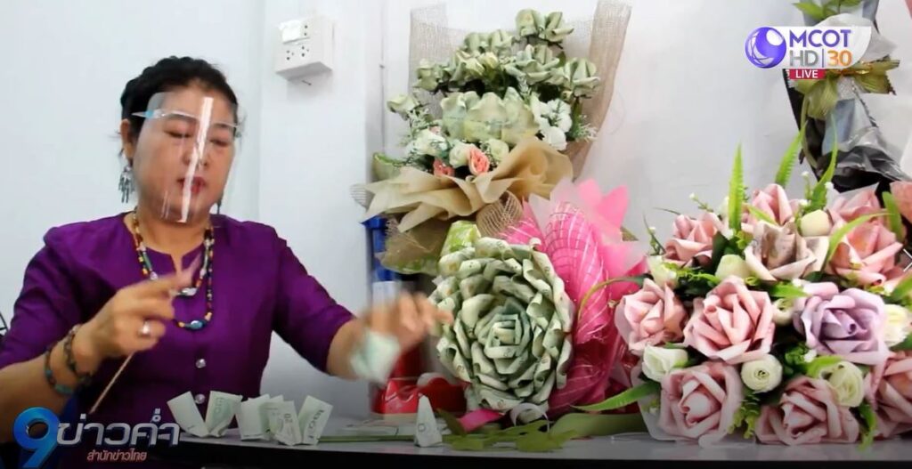 ส่วนบรรยากาศที่ร้านดอกไม้ประดิษฐ์เมืองราชบุรี ที่นี่จะประดิษฐ์ดอกไม้จากดินญี่ปุ่นสีสันสวยงามหลากสี มีหลายราคา แต่ที่น่าสนใจคือ ช่อดอกไม้จากธนบัตร ที่นางชลธิชา แก้วมณี เจ้าของร้าน กำลังเร่งมือพับกลีบดอกไม้จากธนบัตรฉบับ 20 บาท 50 บาท 100 บาท 500 บาท และ 1,000 บาท ตกแต่งด้วยดอกไม้ผูกโบว์อย่างสวยงาม มีทั้งรูปหัวใจจะเป็นช่อใหญ่ เพื่อเข้าช่อดอกเตรียมส่งลูกค้าที่จะเตรียมนำไปมอบแก่คู่รัก แฟนสาว หรือภรรยา ในวันวาเลนไทน์ มีลูกค้าประจำ ทำช่อธนบัตรเป็นช่อดอกไม้ทุกปี เจ้าของร้านบอกว่า ช่วงนี้มีการสั่งทำหลายช่อ สามีแอบมาเซอร์ไพรส์ภรรยา คู่รักที่จีบกันใหม่ๆ ซอร์ไพรส์กัน ส่วนการทำจะคิดค่าแรงทำก้านละ 30 บาท ไม่รวมเงินธนบัตร ราคานี้ทำมาตั้งแต่ปี 2547 ไม่ขึ้นราคา