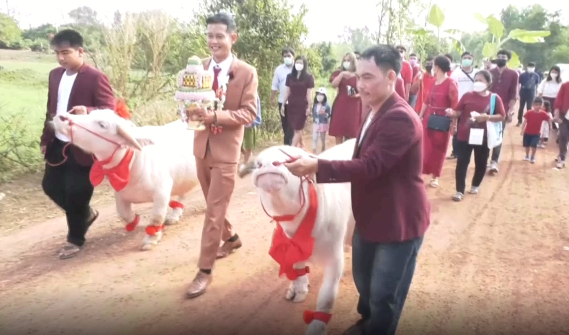 พิจิตร 14 ก.พ.-แปลกไม่เหมือนใคร! เจ้าบ่าวจูงควายเผือกคู่ราคาหลักล้านมาเป็นสินสอด สู่ขอลูกสาวกำนันตำบลคลองทราย จ.พิจิตร เเต่งงาน