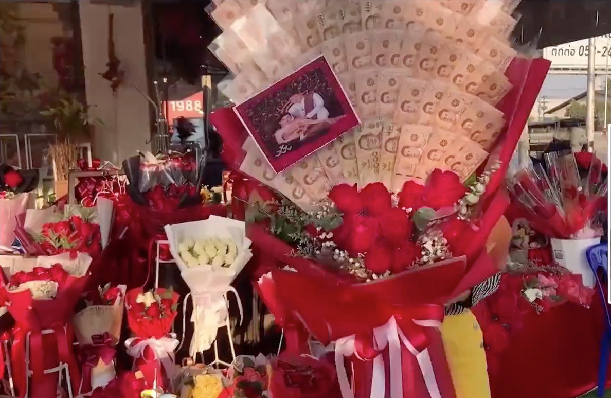 หน้าตาของช่อดอกไม้ที่ใครก็อยากได้ ซึ่งประดับไปด้วยธนบัตรใบละ 1,000 บาท จำนวน100 ฉบับ รวม 100,000 บาท ซึ่งร้านดอกไม้อิศรางฟอร์ริส ในตลาดดอกไม้นิ่มซี่เส็งที่เชียงใหม่จัดตามความต้องการของลูกค้าที่สั่งไว้ เพื่อมอบให้กับคนรัก เจ้าของร้านดอกไม้แห่งนี้บอกว่า มีลูกค้าหลายรายที่สั่งช่อดอกไม้แบบนี้ราคาสูงสุดที่สั่งเข้ามามูลค่า 150,000 บาท แม้ภาพรวมของตลาดดอกไม้ในวันวาเลนไทน์ปีนี้จะไม่คึกคักเท่ากับปีที่แล้ว ด้วยปัญหาของโควิด-19 และเศรษฐกิจ รวมทั้งราคาดอกกุหลาบที่แพงขึ้น แต่ยังมีลูกค้าสั่งช่อดอกไม้เข้ามามากกว่าปกติ