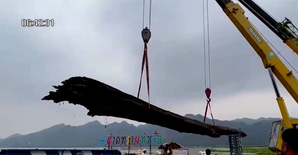 หลังมีคนพบต้นตะเคียนโผล่ขึ้นจากแม่น้ำแม่กลอง ผู้นำท้องถิ่น ผู้นำชุมชนและหน่วยปฏิบัติการทางน้ำ มูลนิธิพิทักษ์กาญจน์ “ทีมสายน้ำ” นำทีมงานลงไปทำการนำต้นตะเคียนทองขึ้นจากน้ำ มาไว้ที่วัดบ้านทอง (ท่าล้อ) ตำบลท่าล้อ อำเภอท่าม่วง จังหวัดกาญจนบุรี คาดว่าอายุราวกว่า 200 ปี ซึ่งตะเคียนทองต้นแรกมีความยาว 17 เมตร วัดรอบต้น 340 เซนติเมตร ส่วนตะเคียนทองต้นที่สองมีความยาว 16 เมตร วัดรอบต้น 290 เซนติเมตร มีน้ำหนักต้นละประมาณ 10 ตัน