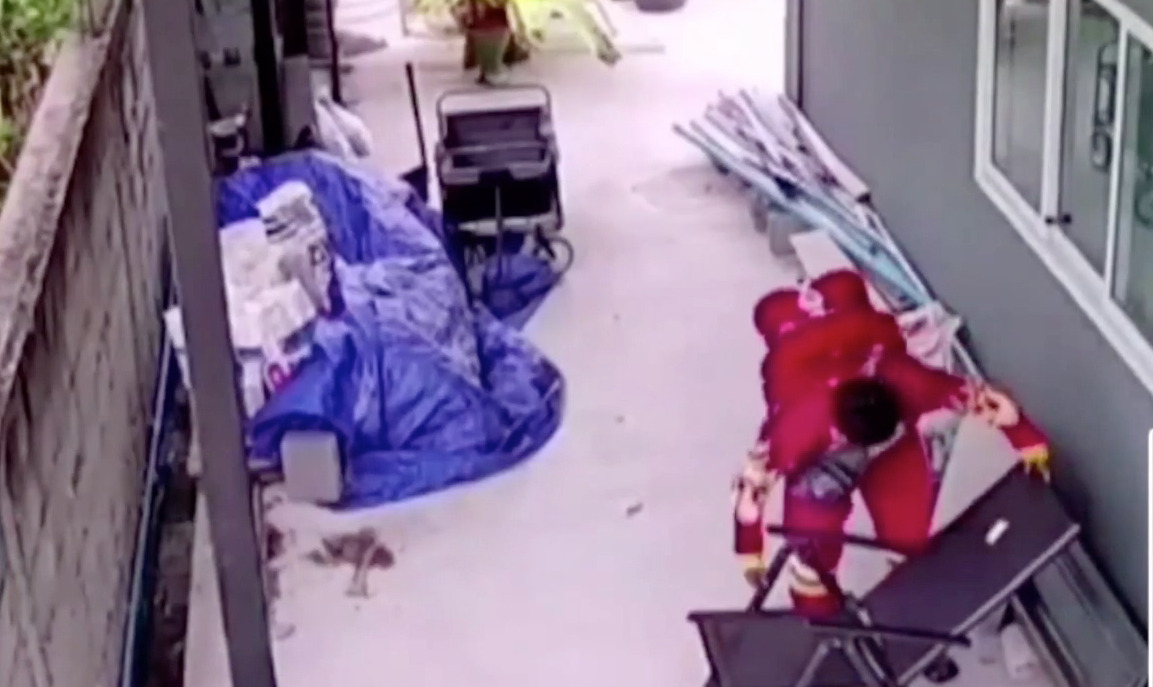 ภาพจากกล้องวงจรปิดจับภาพชาย 3 คน แต่งตัวเป็นแก๊งเชิดสิงโต โดย 2 คนแรกเดินอ้อมไปทางข้างบ้าน แล้วส่องกระจกหน้าต่างดูภายในบ้าน จากนั้นหยิบเอาเก้าอี้สนามไป 2 ตัว แล้วเอาไปซ่อนไว้ในป่า ขณะที่อีกคนกางเก้าอี้นอนหลังบ้านหลับสนิท หลังก่อเหตุก็เดินออกจากบ้านหลังดังกล่าวอย่างใจเย็น
