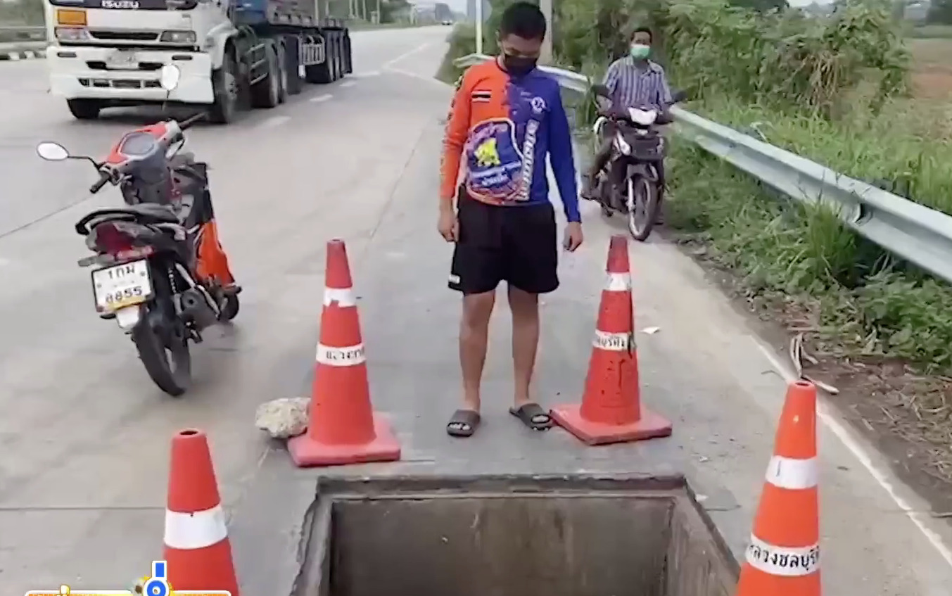 ท่อระบายน้ำขนาดความกว้าง 1.20 เมตร ยาว 1.50 เมตร ลึก 1.50 เมตร ที่ถูกคนร้ายมาย่องขโมยงัดเอาเหล็กปิดฝาท่อหายไป แล้วปล่อยให้ปากหลุมว่างเปล่าดูแล้วน่าหวาดเสียว เนื่องจากอยู่บนถนนสายหลัก 349 พนัสนิคม – หนองชาก (ขาเข้าหนองชาก) ช่วงยูเทิร์นสำนักขาม ม.5 ต.หนองบอนแดง อ.บ้านบึง จ.ชลบุรี เป็นเขตติดต่อกับอำเภอพนัสนิคม