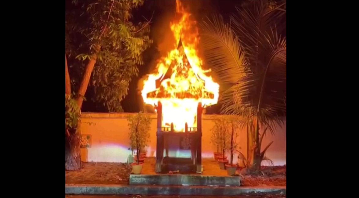 โลกออนไลน์แชร์คลิปวิดีโอจาก TikTok ขณะเกิดเพลิงไหม้ศาลพระภูมิอย่างรุนแรง ก่อนที่จะมีผู้หญิงรีบวิ่งเอาน้ำมาดับ และขณะเพลิงโหมลุกไหม้อยากหนัก ชายอีกคนได้ใช้ไม้เข้าไปตีซ้ำจนศาลพังก่อนฉีดน้ำดับ เมื่อเพลิงสงบศาลก็เหลือแต่ซาก