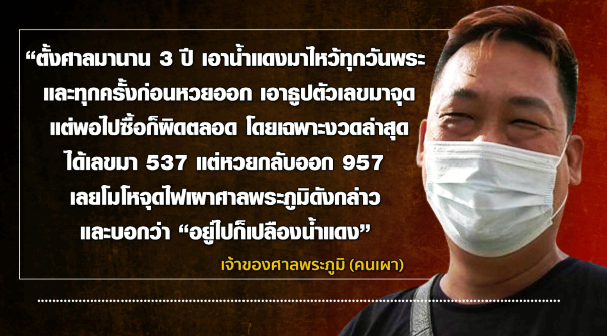 จุดเกิดเหตุอยู่ตรงข้ามหน้าบ้านหลังหนึ่งใน ต.อิสาณ อ.เมือง จ.บุรีรัมย์ พบศาลพระภูมิทรงเรือนไทยที่ถูกเผาเหลือแต่ซาก ชาวบ้านเอาใบมะพร้าวมาคลุมไว้ น.ส.เบนโจ อายุ 27 ปี เจ้าของคลิปเล่าว่า เจ้าของศาลพระภูมิดังกล่าวเป็นของญาติ ชื่อนิกร อายุ 40 ปี เหตุเกิดเมื่อเวลาประมาณ 21.00 น. คืนวันที่ 17 ก.พ.ที่ผ่านมา ซึ่งเป็นวันหวยออก ตอนแรกไม่รู้ว่าเขาจะเผาศาลพระภูมิ ตอนนั้นออกมาเก็บผ้าที่ระเบียงมองมาเห็นเหมือนมีใครจุดเทียนเอาไว้ที่ศาลพระภูมิ แต่ดูแสงไฟผิดปกติ จึงลงมาดูเห็นไฟลุกจึงถือขวดน้ำจะไปดับ แต่นายนิกรเดินออกมาจากบ้านบอกไม่ต้องดับ เพราะเป็นคนจุดไฟเผาเอง พอไฟเริ่มลุกไม้เกือบทั้งหลัง นายนิกรยังเอาไม้ไปตีซ้ำจนศาลพระภูมิพัง ก่อนจะฉีดน้ำดับ ทั้งเล่าถึงที่มาที่ไปของศาลพระภูมินี้ว่า เป็นเพราะนายนิกรเคยฝันเห็นผีผู้หญิงหัวขาดมาขออยู่ด้วยจึงตั้งศาลพระภูมิให้ ซึ่งจุดนั้นตรงทางสามแพร่งพอดี หลังตั้งศาลผีผู้หญิงหัวขาดก็หายไป แต่ผีตัวอื่นมาอยู่อีกหลายตน ทำให้นายนิกรโมโหว่าตั้งศาลให้ยังตามมาหลอกหลอน ประจวบขอหวยหลายครั้ง แต่ไม่เคยถูกสักที มีแต่เฉียดไปเฉียดมา ทั้งที่ก็เอาน้ำแดงมาไหว้ทุกวันพระ และทุกครั้งก่อนหวยออกมาตลอด 3 ปีที่ผ่านมา โดยเฉพาะงวดล่าสุดที่ได้เลข 537 แต่หวยกลับออก 957 ทำให้นายนิกรโมโหจุดไฟเผาศาลพระภูมิ ทั้งบอกว่า “อยู่ไปก็เปลืองน้ำแดง” แต่จะตั้งศาลให้ใหม่ใหญ่กว่าเดิม อาจจะเป็นทรงโมเดิร์นเผื่อผีจะชอบ