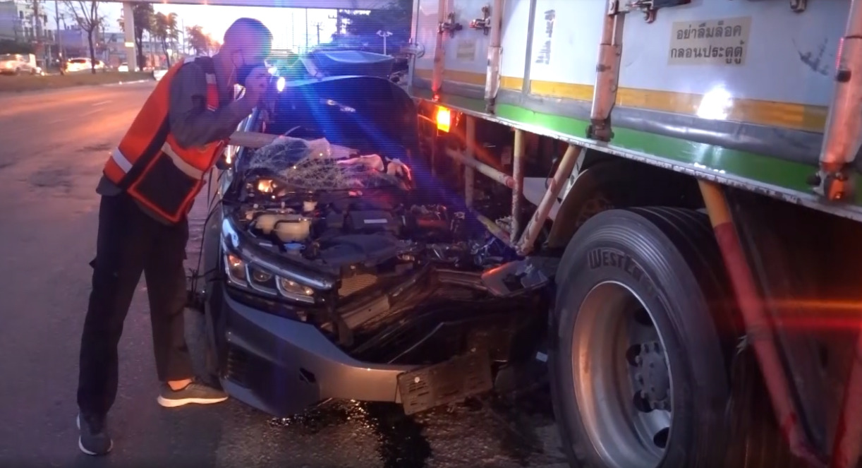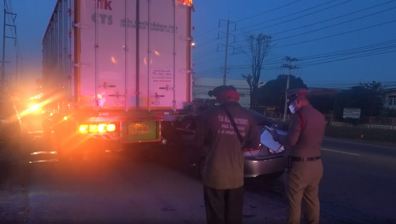 ตำรวจ สภ.แสนภูดาษ จ.ฉะเชิงเทรา พร้อมหน่วยกู้ภัยฉะเชิงเทรา เข้าตรวจสอบเหตุรถชนกัน บริเวณทางเข้าวัดแสนภูดาษ ถนนสิริโสธร ขาเข้าบางปะกง หมู่ 3 ตำบลแสนภูดาษ อำเภอบ้านโพธิ์ จังหวัดฉะเชิงเทรา พบรถเก๋ง สีบรอนซ์-ดำ พุ่งชนอัดท้ายรถบรรทุกหกล้อ ฮีโน่ สีขาว มีนายวิชัยเดช อายุ 51 ปี เป็นคนขับ ส่วนหญิงอายุ 36 ปี คนขับรถเก๋งบาดเจ็บ