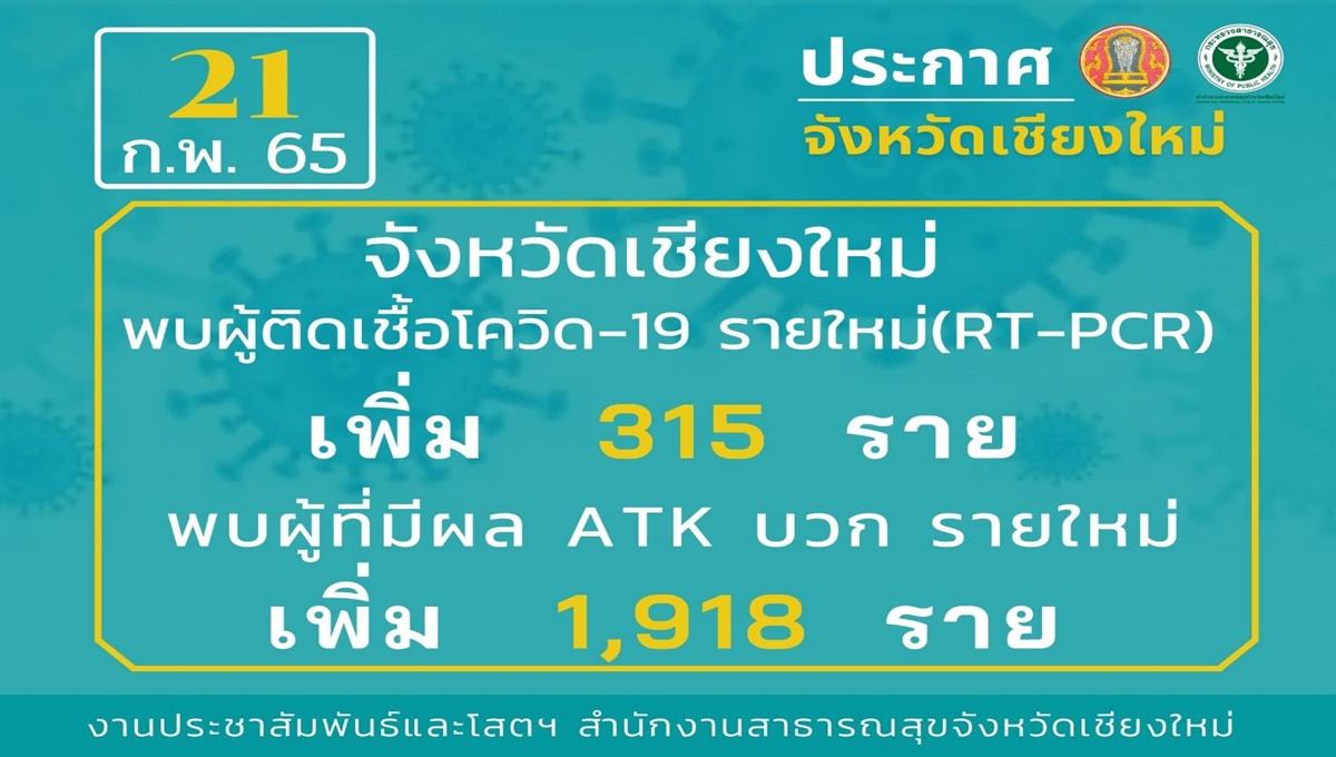 เชียงใหม่ 21 ก.พ. – เชียงใหม่โควิดพุ่งไม่หยุด พบติดเชื้อใหม่-ผลตรวจเอทีเคบวกทะลุ 2,000 ราย ผู้รักษาตัว 2,609 ราย