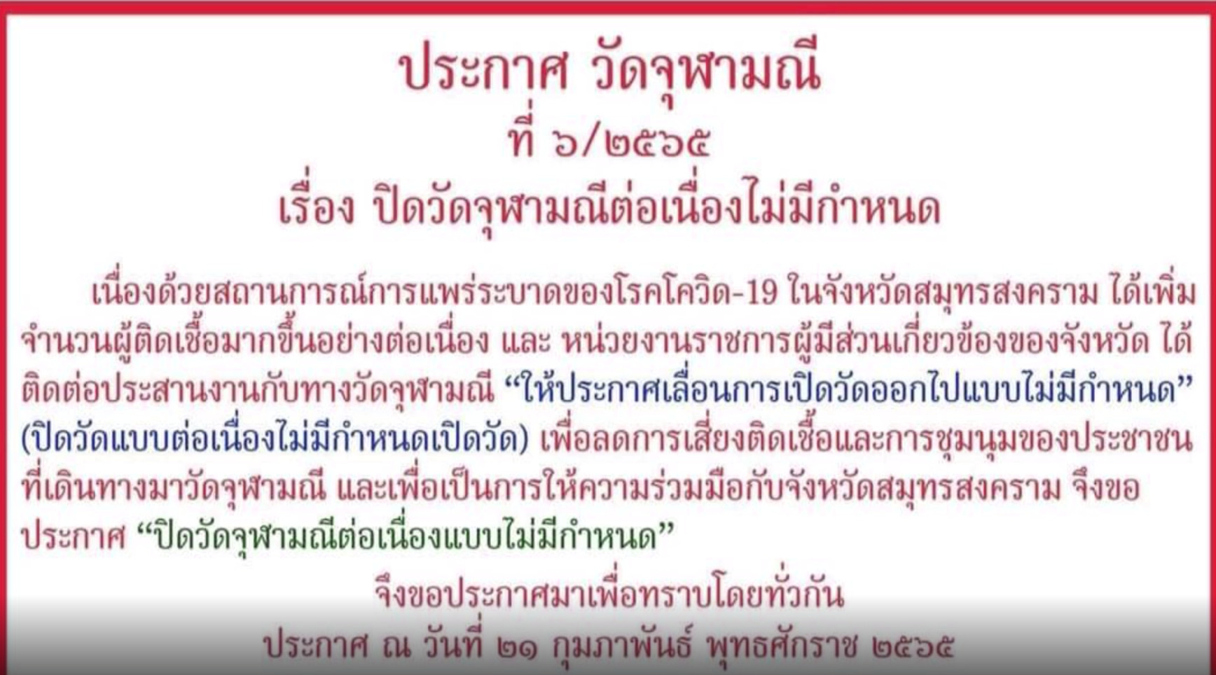 นายกนกเดช ลิขิตวัฒนเศรษฐ ไวยาวัจกร วัดจุฬามณี เผยว่าเพื่อลดการเสี่ยงติดเชื้อและการชุมนุมของประชาชนที่เดินทางมาวัดจุฬามณี ทางวัดจึงออกประกาศฉบับที่ 6/2565 “ปิดวัดจุฬามณีต่อเนื่องแบบไม่มีกำหนด” จึงขอประกาศมาเพื่อทราบโดยทั่วกัน ประกาศ ณ วันที่ 21 กุมภาพันธ์ 2565 เพื่อเป็นการให้ความร่วมมือกับทางจังหวัด และให้สอดคล้องกับประกาศยกระดับเตือนภัยโควิดของกระทรวงสาธรณสุข สำหรับจังหวัดสมุทรสงคราม มียอดผู้ติดเชื้อสะสมตั้งแต่วันที่ 1 มกราคม 2565 ถึงวันที่ 21 กุมภาพันธ์ 2565 อยู่ที่ 1,589 คน ไม่มีผู้เสียชีวิต