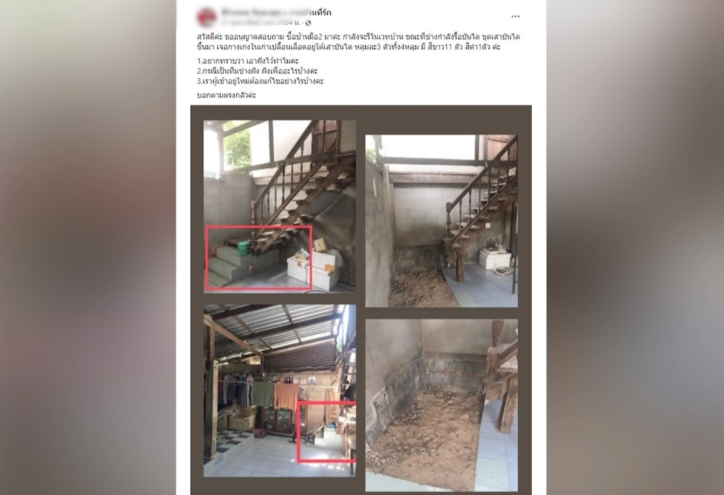 ผู้โพสต์ระบุว่า “สวัสดีค่ะ ขออนุญาตสอบถาม ซื้อบ้านมือ 2 มาค่ะ กำลังจะรีโนเวตบ้าน ขณะที่ช่างกำลังรื้อบันได ขุดเสาบันไดขึ้นมา เจอกางเกงในเก่าเปื้อนเลือดอยู่ใต้เสาบันได หลุมละ 3 ตัว ทั้ง 4 หลุม มีสีขาว 11 ตัว สีดำ 1 ตัว ค่ะ