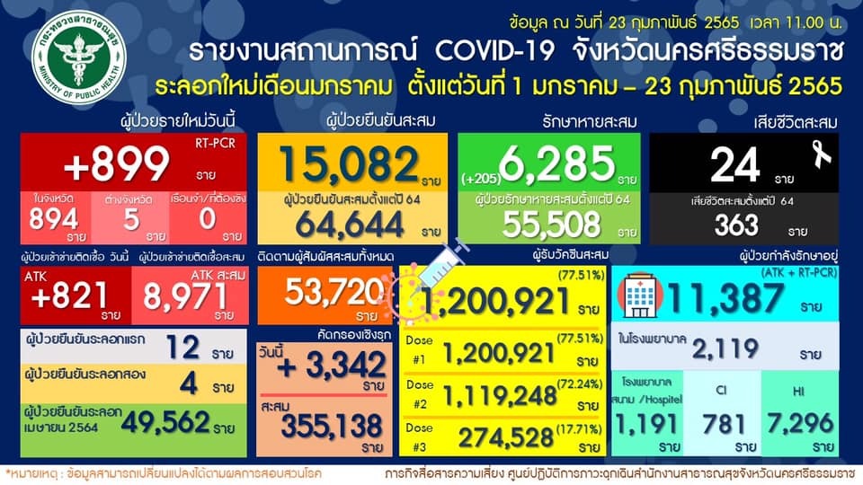 นพ.จรัสพงษ์ สุขกรี นพ.สสจ.นครศรีธรรมราช แถลงข่าวถึงสถานการณ์โรคโควิด-19 วันนี้ (23 ก.พ.) ว่า ยอดรวมการติดเชื้อทั้งหมด 1,720 ราย แยกเป็น ATK 821 ราย และ RT-PCR 899 ราย ซึ่งการติดเชื้อส่วนใหญ่เป็นการติดเชื้อในครอบครัว โดยมีอำเภอที่ติดเชื้อสูงสุด คือ อ.ทุ่งสง 220 ราย, อ.ท่าศาลา 155 ราย, อ.ลานสกา 135 ราย, อ.พระพรหม 122 ราย, อ.ปากพนัง 109 ราย โดยยอดการติดเชื้อวันนี้สูงกว่าเมื่อวานที่ 1,600 กว่าราย ซึ่งตอนนี้ได้มีการสื่อสารกับประชาชนว่าถ้าติดเชื้อและไม่มีอาการให้รักษาที่บ้าน โดยผู้ว่าราชการจังหวัดนครศรีธรรมราช จะมีการทำโครงการส่งอาหารให้ปรุงเองหรือถ้าใครไม่สะดวกก็ในการปรุงก็จะทำเป็นข้าวกล่องส่งให้ โดยจะมีนายอำเภอแต่ละอำเภอเป็นคนดำเนินการและมีการเตรียมพร้อมสำหรับ รพ.สนาม หากจำนวนผู้ป่วยเพิ่มขึ้น โดยสิ่งที่อยากจะขอให้ประชาชนร่วมมือก็ คือ การฉีดวัคซีนให้ครบตามที่ สธ.กำหนด