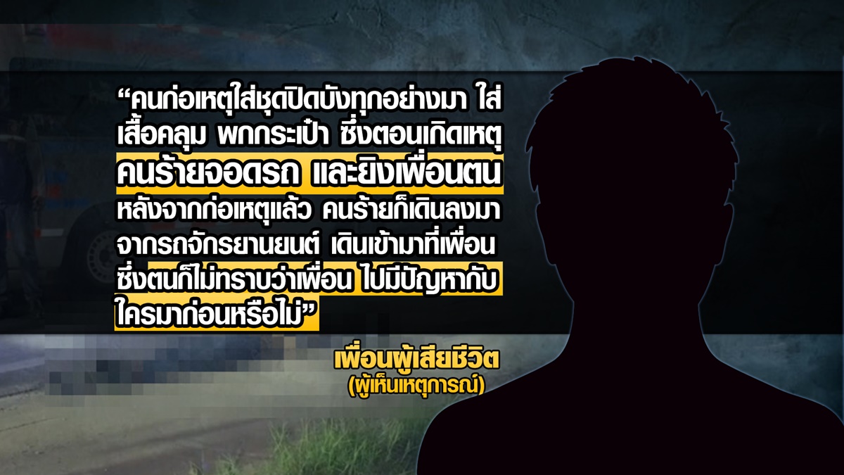 สอบถามเพื่อนของผู้เสียชีวิต เล่าว่า ก่อนเกิดเหตุได้ไปนั่งกินหมูกระทะที่บ้านเพื่อนประมาณ 7 คน จากนั้นตนและเพื่อนที่เสียชีวิตได้ขี่รถจักรยานยนต์กลับบ้าน โดยขี่ตามกันมา ห่างกันประมาณ 20 เมตร และสังเกตเห็นรถจักรยานยนต์คันหนึ่ง มีคนขี่และคนซ้อนท้ายขี่สวนมา ก่อนที่รถคันดังกล่าวจะวนรถกลับมา เมื่อมาถึงจุดเกิดเหตุ เห็นรถจักรยานยนต์คันนั้นขี่ประกบเพื่อนของตน จากนั้นได้ยินเสียงดัง ตอนแรกคิดว่าเป็นเสียงประทัด แต่พอรู้ว่าเป็นเสียงปืน ก็ตกใจมาก จึงขี่รถหนีไปแอบ ก่อนจะวนกลับมาดูเพื่อนและเรียกกู้ภัย