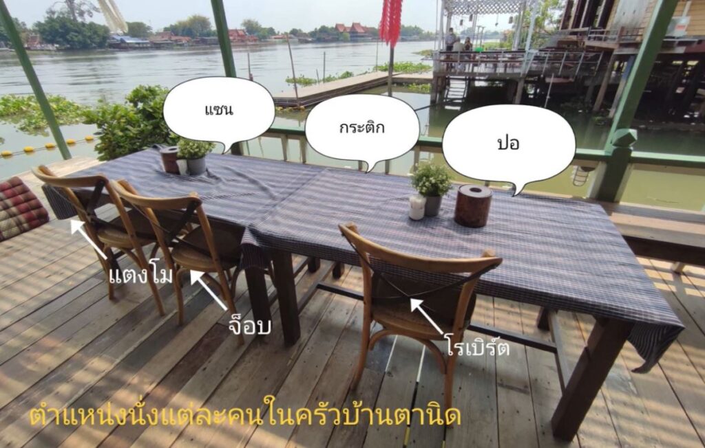นางสาววิชิตา บอกว่า ต่อโต๊ะหันด้านข้างเข้าแม่น้ำเจ้าพระยา นั่งได้ข้างละ 3 คน โดยด้านทิศเหนือโต๊ะ ฝั่งติดแม่น้ำเจ้าพระยา มีแตงโมนั่ง ถัดมาตรงกลาง เป็นนายนิทัศน์ หรือจ๊อบ ถัดมาเป็นเบิร์ต ส่วนอีกด้านของโต๊ะ มีกระติก นั่งตรงข้ามแตงโม ตรงกลางเป็น แซน นั่งตรงข้ามนายจ๊อบ ถัดมาเป็น ปอ นั่งตรงข้ามนายเบิร์ต โดยนายปอจะเป็นคนสั่งอาหารหลายรายการ