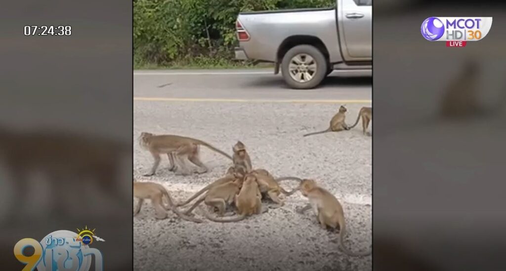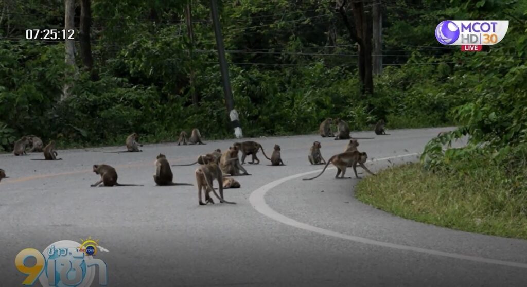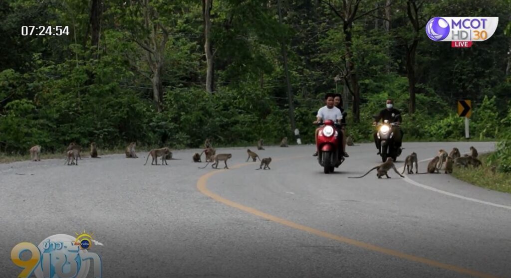 ผู้สื่อข่าวจึงเดินทางไปตรวจสอบ พบฝูงลิงวอกและลิงแสมจำนวนมากออกมานั่งรอคอยอาหารและผลไม้ จากผู้ใจบุญและผู้สัญจรผ่านไปมาบนท้องถนน บางช่วงเป็นทางโค้ง ทำให้รถยนต์และรถจักรยานยนต์หลายคันต้องขับกันอย่างระมัดระวัง และต้องคอยบีบแตรไล่