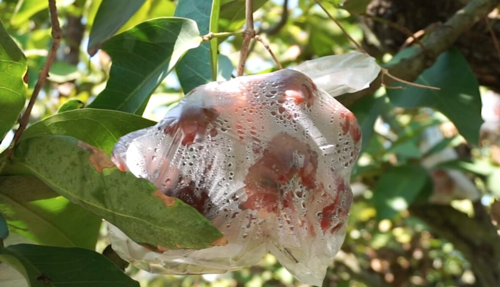 ช่วงฤดูหนาวชมพู่จะเริ่มออกดอกติดผล ช่วงนี้ต้องบำรุงด้วยการใส่ปุ๋ยสูตร 15-15-15 พอดอกโรยก็เริ่มห่อผลด้วยถุงพลาสติกเจาะรูเพื่อระบายอากาศ หลังจากนั้น 45 วันก็สามารถเก็บผลขายได้ ในแต่ละรอบปีสามารถเก็บผลผลิตชมพู่ได้ 2-3 รอบ รอบที่เก็บผลผลิตได้ดีอยู่ในช่วงเดือนธันวาคม-กุมภาพันธ์ และแต่ละครั้งจะเก็บผลรวมน้ำหนักแล้วมากกว่า 4,000 กิโลกรัม แต่ปีนี้สภาพอากาศเอื้ออำนวย ปริมาณน้ำไม่ขาด ผลผลิตรวมกันคาดว่าจะถึง กว่า 10 ตัน