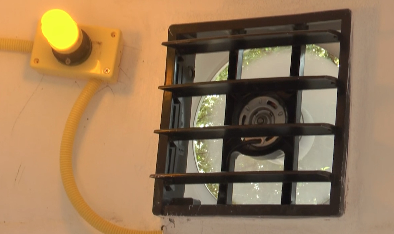 ใกล้กันเป็นส้วมไฮเทค ที่ทำมาจากตู้อบสมุนไพรที่ถูกทิ้ง หลวงพ่อนำมาปรับใหม่ ด้วยการเทพื้น วางโถแบบชักโครก เดินท่อน้ำ ทาสีด้านในให้ดูสว่างเข้ากับแสงไฟดวงเล็กที่ติดอยู่ด้านบนใกล้กับพัดลมดูดอากาศ พัดลมอัตโนมัติจากความคิดของหลวงพ่อ เพราะเมื่อเปิดประตูเข้าไปภายในพัดลมยังคงเป็นปกติ แต่เมื่อปิดประตูเมื่อไหร่ บานพับพัดลมก็จะปรับทิศทางคว่ำหน้าลงดูดอากาศภายนอกเข้ามาเป่าให้กับคนที่กำลังนั่งปลดทุกข์สุขใจเย็นสบาย จะนั่งนานแค่ไหนก็ไม่ต้องห่วง หลวงพ่อท่านบอกมันเป็นเรื่องของอากาศที่แปรผัน เมื่อประตูปิด อากาศภายในน้อยมันก็จะดูดอากาศภายนอกเข้ามา มู่ลี่หรือบานเกร็ดพัดลมก็จะถูกดึงให้คว่ำลงใบพัดที่ยังทำงานก็จะเป่าลมลงมาง่ายๆไม่ได้ซับซ้อนอะไร งานนี้เรียกว่าครบเครื่องทั้งเรื่องกินและเรื่องขับถ่าย วัดไหนหรือใครอยากอาความคิดนี้ไปใช้หลวงพ่อบอกไม่หวง