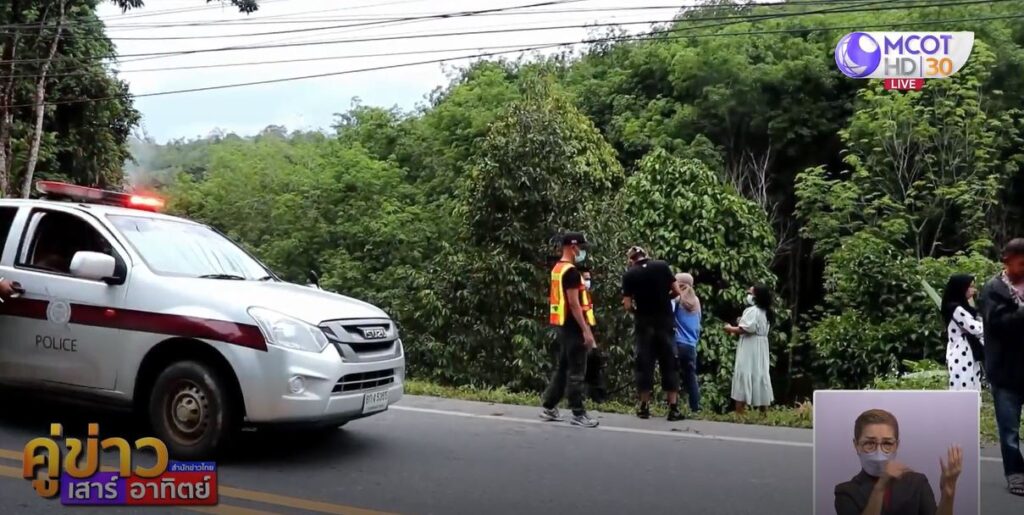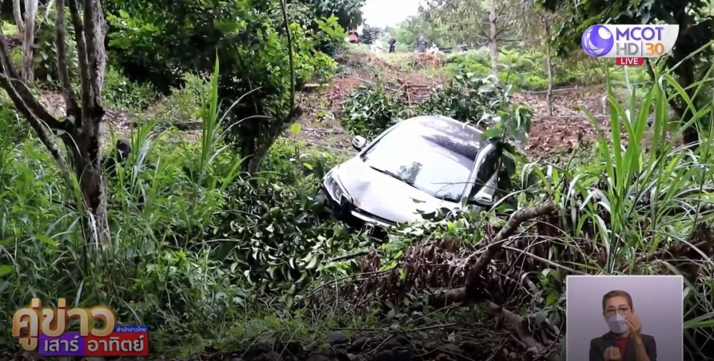 จุดเกิดเหตุเป็นทางโค้งลงเขา มีคนยืนอยู่ริมทางหลายคน ทั้งเด็กและผู้ใหญ่ เด็กๆ ต่างร้องไห้ด้วยอาการตกใจ พบรอยล้อรถตกลงไปในเหวข้างทาง เมื่อมองลงไปในเหวด้านล่างเป็นสวนผลไม้ของชาวบ้าน พบต้นมังคุดหักเป็น 2 ท่อน บริเวณก้นเหวซึ่งอยู่ลึกจากถนน 15 เมตร พบรถเก๋งสีขาว สภาพกันชนด้านหน้าหลุด รถตะแคงข้างอยู่ก้นเหว อีกประมาณ 2 เมตร รถก็จะตกลงไปในลำธาร ตรวจสอบไม่มีผู้ใดได้รับบาดเจ็บ