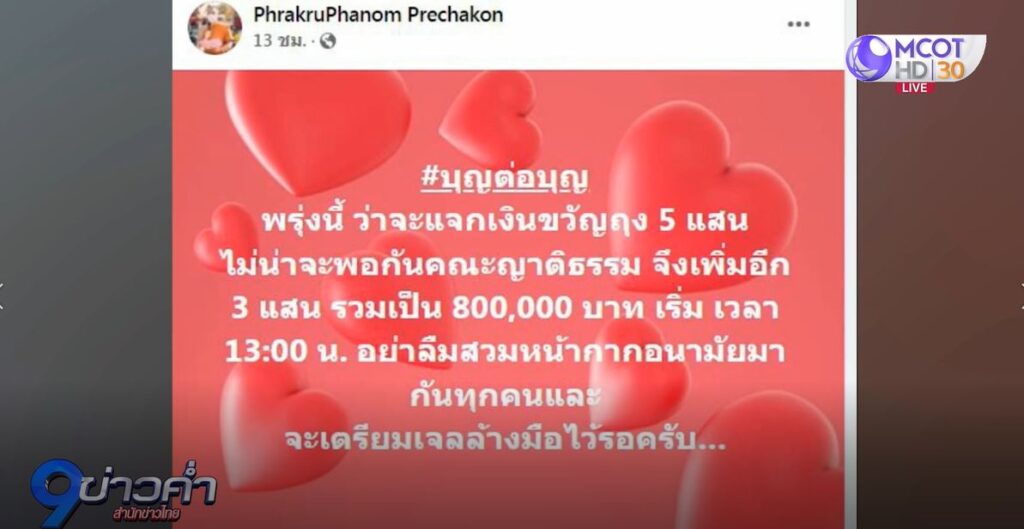 อย่างไรก็ตาม หลังแจกเงินตอนกลางวันไปแล้ว ช่วงหัวค่ำ พระครูไก่โพสต์เฟซบุ๊กอีกว่า #บุญต่อบุญ พรุ่งนี้ว่าจะแจกเงินขวัญถุง 5 แสนบาท ไม่น่าจะพอกัน คณะญาติธรรมจึงเพิ่มอีก 3 แสน รวมเป็นเงิน 8 แสนบาท เริ่มเวลา 13 นาฬิกา อย่าลืมสวมหน้ากากอนามัยกันทุกคน และจะเตรียมเจลล้างมือไว้รอ”