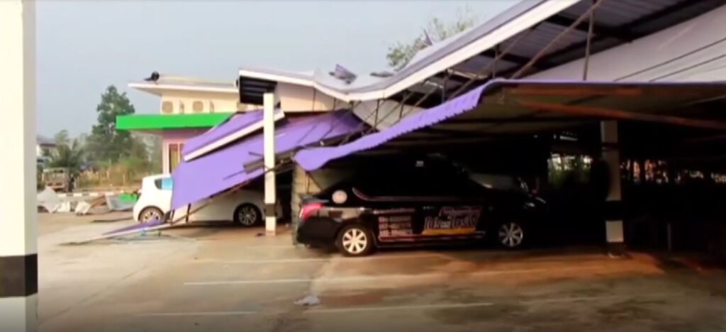 เหตุพายุฤดูร้อนพัดถล่ม จ.บุรีรัมย์ อย่างรุนแรง โดยเฉพาะ อ.นางรอง พายุพัดเอาหลังคาโรงสีข้าว ลอยไปกระแทกกับหลังคาออฟฟิศ โรงเรียนสอนขับรถยนต์ที่อยู่ใกล้กัน จนหลังคาพังถล่มลงมา ทับรถยนต์ที่จอดอยู่ได้รับความเสียหาย 4 คัน พนักงานสอนขับรถและลูกค้าที่เข้ามาใช้บริการกว่า 20 คน ต่างพากันวิ่งหนีเอาตัวรอด ไม่มีใครได้รับบาดเจ็บ