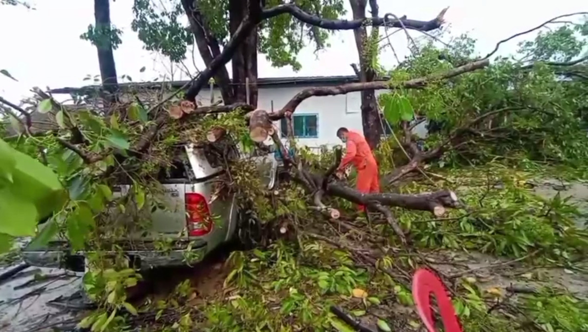 ขณะที่ จ.ร้อยเอ็ด เกิดพายุฤดูร้อนพัดรุนแรงในพื้นที่ อ.โพนทอง นานกว่า 30 นาที ทำให้บริเวณวิทยาลัยเทคโนโลยีพณิชยการโพนทอง มีต้นหว้าและกิ่งไม้ขนาดใหญ่หักทับรถกระบะโตโยต้า สีบรอนซ์ทอง ทะเบียน กต 1255 กาฬสินธุ์ เสียหาย เจ้าหน้าที่ป้องกันและบรรเทาสาธารณภัยเทศบาลตำบลโพนทอง ได้นำเลื่อยยนต์ตัดต้นไม้ กิ่งไม้ที่ล้มทับรถและกีดขวางการจราจรออกแล้ว