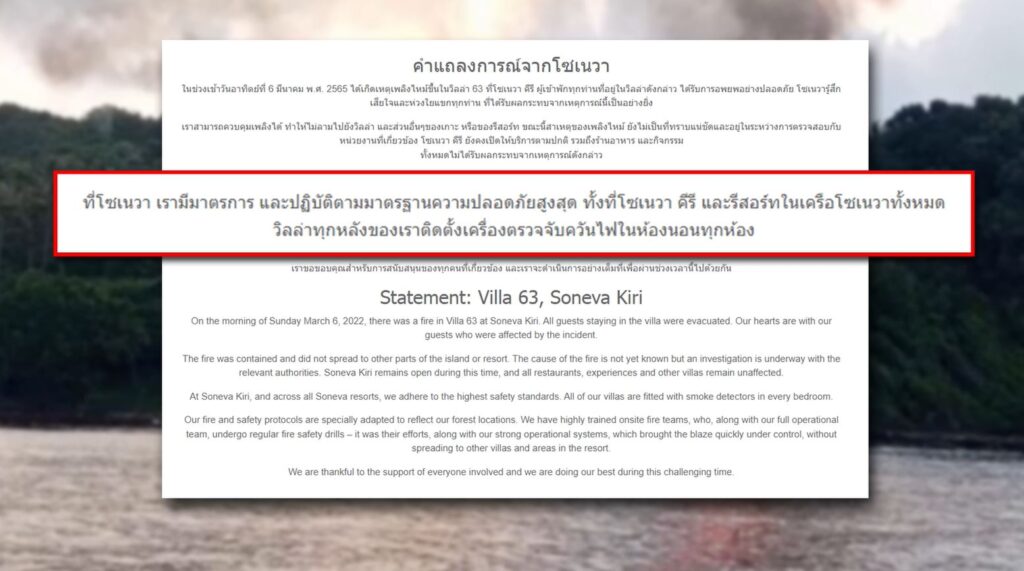ที่โซเนวา เรามีมาตรการ และปฏิบัติตามมาตรฐานความปลอดภัยสูงสุด ทั้งที่โซเนวา คีรี และรีสอร์ทในเครือโซเนวาทั้งหมด วิลล่าทุกหลังของเราติดตั้งเครื่องตรวจจับควันไฟในห้องนอนทุกห้อง ระเบียบการจัดการด้านอัคคีภัย และความปลอดภัยของเราได้รับการดูแลเป็นพิเศษ เพื่อให้เหมาะสมกับพื้นที่ป่า เรามีทีมดับเพลิงที่ได้รับการฝึกฝนมาเป็นอย่างดี รวมทั้งมีทีมพร้อมปฏิบัติการเต็มรูปแบบ ซึ่งได้รับการฝึกซ้อมเกี่ยวกับความปลอดภัยจากอัคคีภัยเป็นประจำ จากความพยายามของเจ้าหน้าที่ควบคู่ไปกับระบบปฏิบัติการที่แข็งแกร่ง เราสามารถควบคุมไฟได้อย่างรวดเร็วโดยไม่ลุกลามไปยังวิลล่าและพื้นที่อื่น ๆ ในรีสอร์ต เราขอขอบคุณสำหรับการสนับสนุนของทุกคนที่เกี่ยวข้อง และเราจะดำเนินการอย่างเต็มที่เพื่อผ่านช่วงเวลานี้ไปด้วยกัน