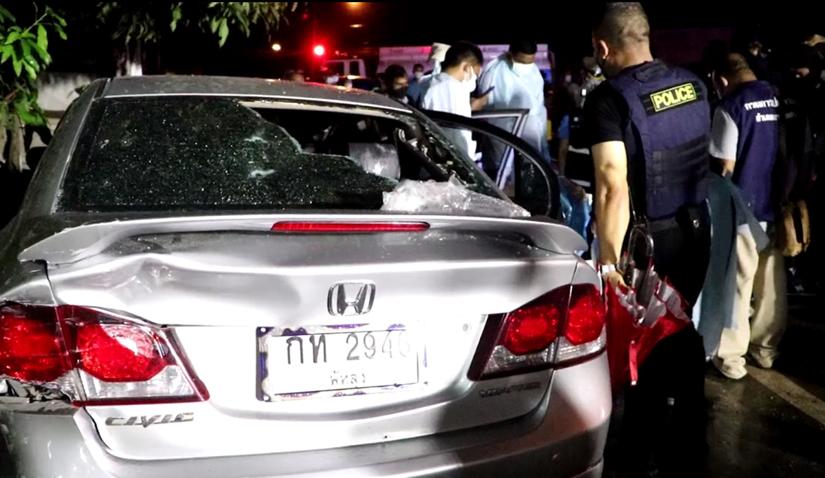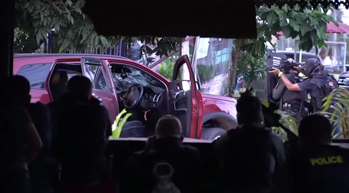 นี่เป็นภาพวินาทีที่เจ้าหน้าที่ตำรวจ สภ.เขาชัยสน จ.พัทลุง ยิงเข้าไปยังรถของคนร้ายที่ถูกต้อนเข้ามาอยู่ในมุมอับ บริเวณใกล้สี่แยกบ้านท่านางพรหม บนถนนสายสี่แยกบ้านท่านางพรหม-ท่าควาย ท้องที่หมู่ 6 ต.โคกม่วง อ.เขาชัยสน ในที่เกิดเหตุพบผู้เสียชีวิต 2 ราย ประกอบด้วย ด.ต.อนันต์ มีแสง ถูกยิงด้วยอาวุธปืนไม่ทราบชนิดที่บริเวณศีรษะ ส่วนตำรวจที่ถูกยิงบาดเจ็บอีก 1 นาย คือ ด.ต.ชัชชัย ศัญโย ถูกยิงด้วยอาวุธปืนไม่ทราบชนิดที่บริเวณแขนขวา บาดเจ็บสาหัส และอีก 1 นาย บาดเจ็บเล็กน้อย คือ ร.ต.อ.นพดา ณัทณพงศ์ ถูกยิงเฉี่ยวที่บริเวณคิ้วด้านขวา และถูกกระจกรถยนต์บาดหลายแห่งตามร่างกาย ส่วนคนร้ายที่ถูกยิงเสียชีวิต ทราบชื่อคือ นายวัชระ รัตนสุวรรณ์ อายุ 38 ปี ขณะที่คนร้ายที่เหลือวิ่งหลบหนีไปได้ 3 ราย โดยคาดว่าคนร้ายอาจถูกยิงบาดเจ็บด้วยอย่างน้อย 1 ราย