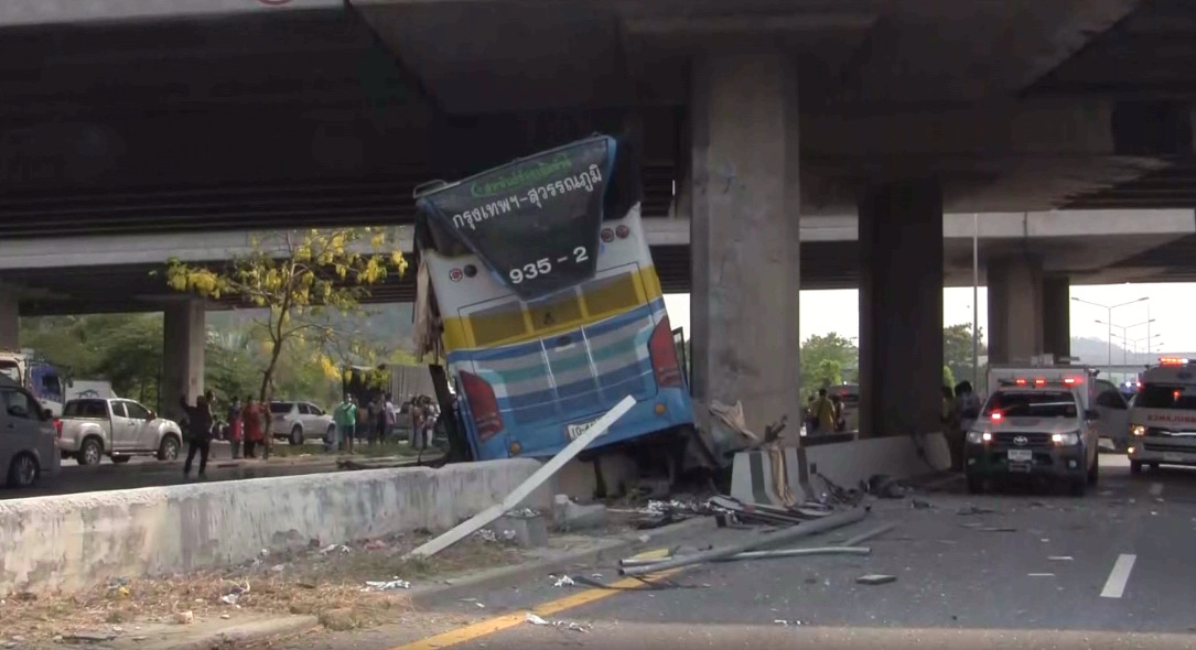 จากกรณีรถทัวร์ปรับอากาศ 2 ชั้น วิ่งระหว่าง กรุงเทพฯ- สุวรรณภูมิ มีผู้โดยสารนั่งมา 32 คน เสียหลักพุ่งชนเสาไฟส่องสว่างบนถนน จากนั้นพุ่งเข้าชนตอม่อของสะพาน ทำให้รถตะแคงพังเสียหายยับเยิน มีผู้โดยสารกระเด็นออกมาข้างนอกรถ บาดเจ็บสาหัส และเสียชีวิตในที่เกิดเหตุ เจ้าหน้าที่สว่างสระบุรี ร่วมกับเจ้าหน้าที่อาสามูลนิธิร่วมกตัญญู ใช้อุปกรณ์ตัดถ่างเข้าให้ความช่วยเหลือผู้ที่ได้รับบาดเจ็บติดภายใน และที่กระเด็นออกมาจากตัวรถ นอนร้องครวญครางอยู่กลางถนน บางรายแขนขาหัก อาการเป็นตายเท่ากัน บางรายสิ้นใจต่อหน้ากู้ภัย จึงได้รีบนำผู้บาดเจ็บทั้งหมดส่ง รพ. และขณะนี้ได้รับรายงานเพิ่มเติมว่ามีผู้เสียชีวิตทั้งสิ้น 8 ราย จากเหตุการณ์นี้