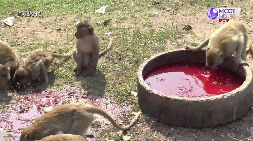 ผู้สื่อข่าวรายงานว่า ที่ตัวเมืองลพบุรี อากาศที่ร้อนระอุ อุณหภูมิพุ่งขึ้นแตะ 39 องศาฯ ทำให้ฝูงลิงที่อาศัยอยู่ฝั่งพระปรางค์สามยอดบางกลุ่มข้ามฝั่ง เพื่อหลบร้อนมาเล่นน้ำในบ่อที่ทางเจ้าหน้าที่ศาลพระกาฬจัดไว้ ซึ่งบริเวณพระปรางค์สามยอด ตามตึก ตลาดเทศบาลทางเจ้าหน้าที่ได้จัดอ่างน้ำไว้ให้ลิงได้ลงเล่นน้ำ คลายความร้อน เพื่อป้องกันไม่ให้ลิงปรางค์สามยอด ลิงตึก ลิงตลาดข้ามเขตแดน แย่งอ่างน้ำ อาหารและเครื่องดื่ม เป็นการลดการบาดหมาง ทะเลาะวิวาท ซึ่งเหตุการณ์เช่นนี้มักเกิดขึ้นในช่วงฤดูร้อน จ่าฝูงมักดุร้าย พาลิงหนุ่มบุกไปอีกพื้นที่ หากไม่มีอาหาร หรือสิ่งผ่อนคลายที่เท่าเทียมกัน
