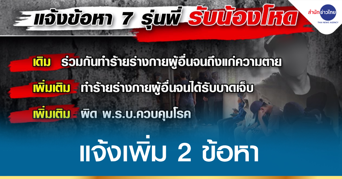 ล่าสุดวันนี้ (16 มี.ค.) ได้แจ้งข้อหาเพิ่มอีก 2 ข้อหา กับรุ่นพี่ทั้ง 7 คน คือ ข้อหาทำร้ายร่างกายผู้อื่นจนได้รับบาดเจ็บ เนื่องจากมีรุ่นน้อง 2 คน ได้รับบาดเจ็บจากการรับน้องครั้งนี้ด้วย นอกจากนี้ พนักงานสอบสวนได้เก็บรวบรวมหลักฐานวัตถุในที่เกิดเหตุ จุดที่จัดกิจกรรมรับน้อง พบถุงจำนวน 10 ถุง มีทั้งขวดสุรา 3 ยี่ห้อ โซดา แก้วพลาสติก กระป๋องเบียร์ ขวดเบียร์ 2 ยี่ห้อ ขวดน้ำดื่ม บุหรี่ไฟฟ้า ซองบุหรี่ ไม้เรียว กล่องยากันยุง ที่วางกระจัดกระจายอยู่บริเวณจุดเกิดเหตุ พร้อมรวบรวมเอกสารพิมพ์ลายนิ้วมือ นำไปประกอบสำนวนดำเนินคดี