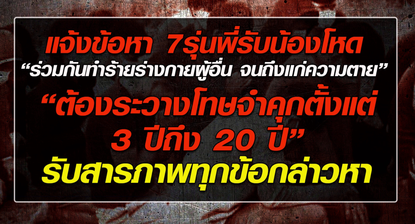 ความคืบหน้าคดีรุ่นพี่รับน้องโหด ชกหน้าอกน้องเปรม อายุ 19 ปี นักศึกษาปี 1 ปวส.ช่างกลโรงงาน มหาวิทยาลัยชื่อดังแห่งหนึ่งใน จ.นครราชสีมา จนเสียชีวิต เมื่อคืนวันที่ 13 มีนาคม รุ่นพี่ 7 คน ถูกแจ้งข้อหาทำร้ายร่างกายผู้อื่นจนถึงแก่ความตาย (น้องเปรมเสียชีวิต) ทำร้ายร่างกายจนได้รับบาดเจ็บ (รุ่นน้องบาดเจ็บ 2 คน) และผิด พ.ร.บ.โรคติดต่อ (มั่วสุมดื่มสุรา)