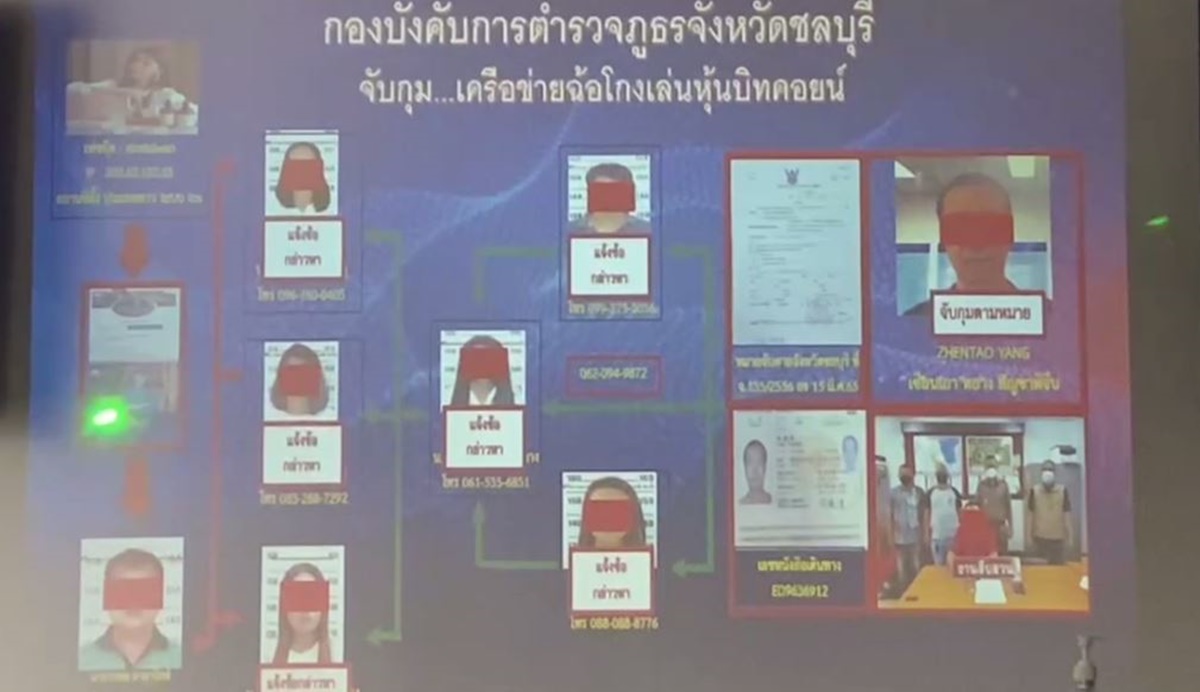 ชลบุรี 18 มี.ค. – ตำรวจชลบุรีจับกุมชาวจีนตั้งแก๊งร่วมกับคนไทย หลอกลงทุนในบิทคอยน์ ทำผู้เสียหายสูญเงินรวมกว่า 1 ล้านบาท