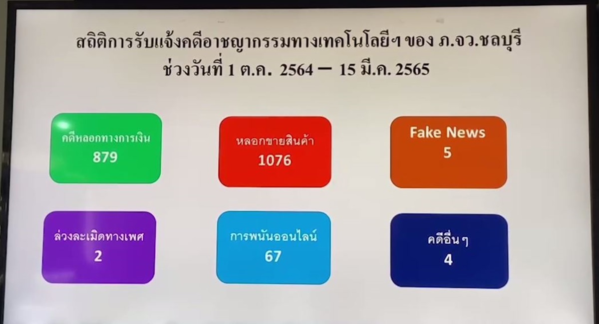 ผู้บังคับการตำรวจภูธรจังหวัดชลบุรี กล่าวว่า นับตั้งแต่สำนักงานตำรวจแห่งชาติ ได้ตั้งศูนย์ ศปอส.ตร. พร้อมระบบรับแจ้งความออนไลน์ เมื่อวันที่ 1 ตุลาคม 2564 จนถึงปัจจุบัน มีคดีความผิดที่ใช้สื่อสังคมออนไลน์เกิดขึ้นถึง 2,033 คดี จึงฝากเตือนประชาชนอย่าหลงเชื่อตกเป็นเหยื่อของแก๊งมิจฉาชีพ ขอให้ตรวจสอบก่อนโอนเงินว่ามีตัวตนจริงหรือไม่ และสำหรับผู้ที่รู้ตัวว่าถูกหลอกลวง สามารถแจ้งความออนไลน์ได้ 3 ช่องทาง คือ www.thaipoliceonline.com หรือสายด่วน 1441 หรือโทร. 081-8663000. – สำนักข่าวไทย